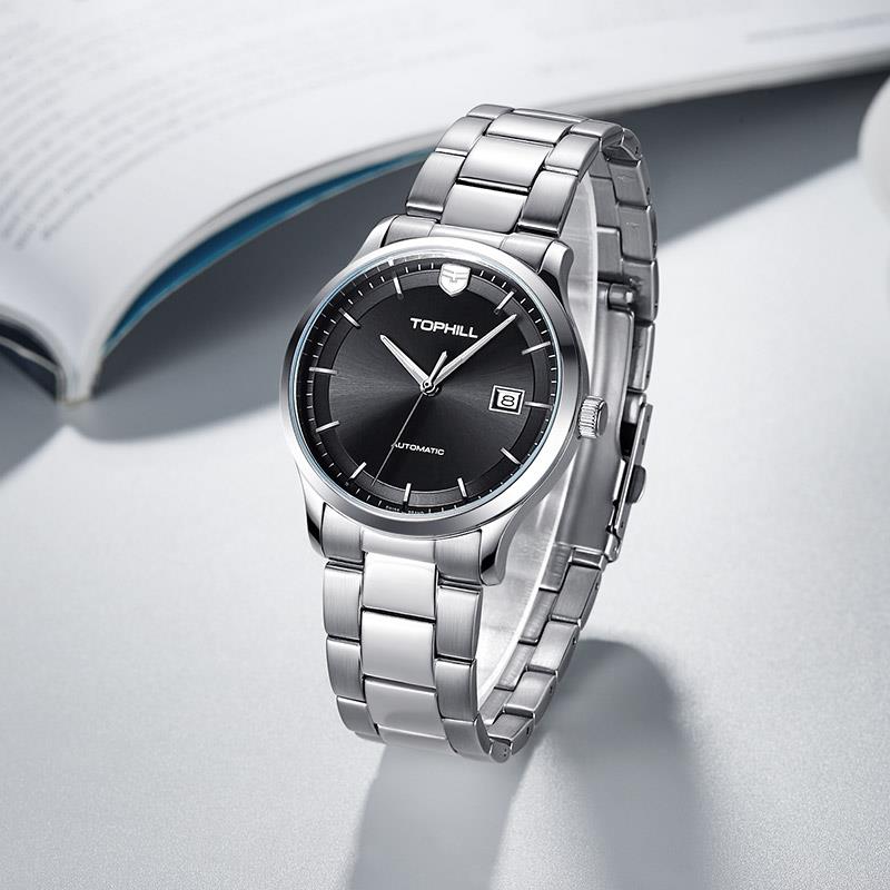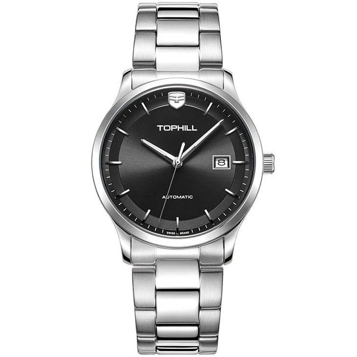 ساعت مچی مردانه تاپ هیل tophill با طراحی روزانه بند استیل و قاب استیل و صفحه گرد مشکی با شیشه ضد خراش وقابلیت داشتن تقویم / شب نما و موتوراتوماتیک ژاپنی با انرژی مکانیکی و مقاوم در برابر آب تا عمق 50 متر به همراه گارانتی بین المللی