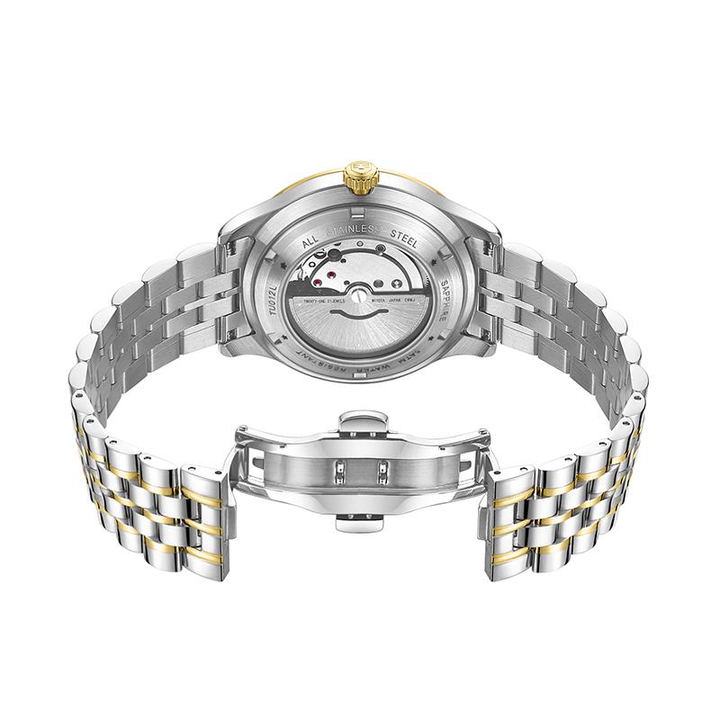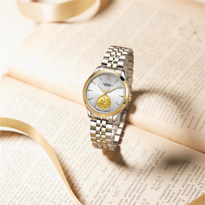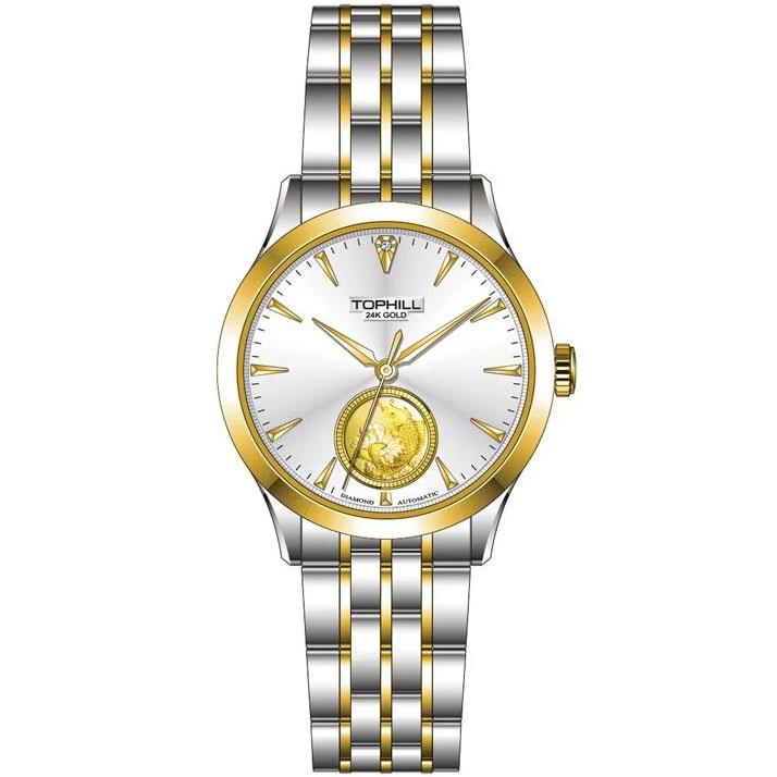 ساعت مچی زنانه تاپ هیل tophill با طراحی روزانه بند فلزی دو رنگ و قاب گرد دو رنگ با صفحه مزین به نگین تقره ای طلایی و موتور اتوماتیک ژاپنی با انرژِی مکانیکی و مقاوم در برابر آب تا عمق 50 متر به همراه گارانتی بین المللی