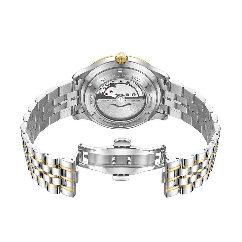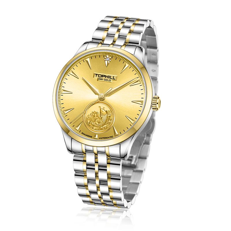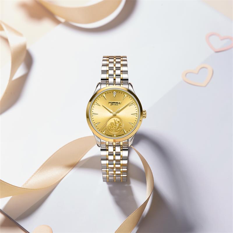 ساعت مچی زنانه تاپ هیل tophill با طراحی روزانه بند فلزی دو رنگ و قاب گرد دو رنگ با صفحه مزین به نگین طلایی و موتوراتوماتیک ژاپنی با انرژِی مکانیکی و مقاوم در برابر آب تا عمق 50 متر به همراه گارانتی بین المللی