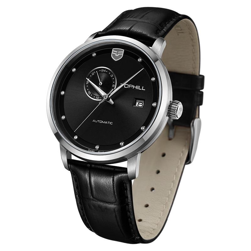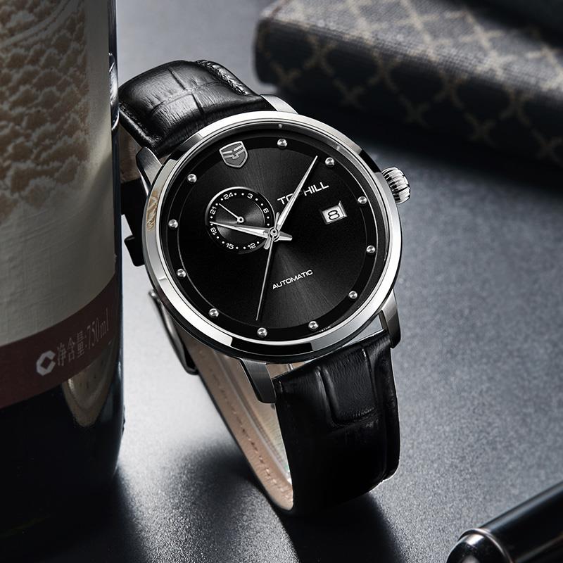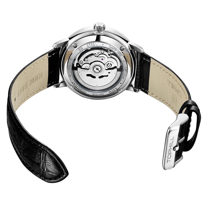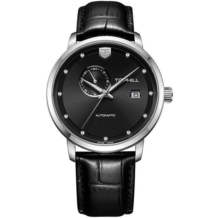ساعت مچی مردانه تاپ هیل tophill با طراحی روزانه بند چرمی و قاب استیل و صفحه گرد مشکی با شیشه ضد خراش و قابلیت داشتن تقویم / روز و شب / شب نما و موتوراتوماتیک ژاپنی با انرژی مکانیکی و مقاوم در برابر آب تا عمق 50 متر به همراه گارانتی بین المللی