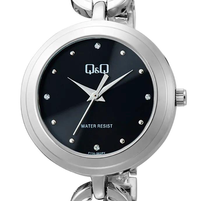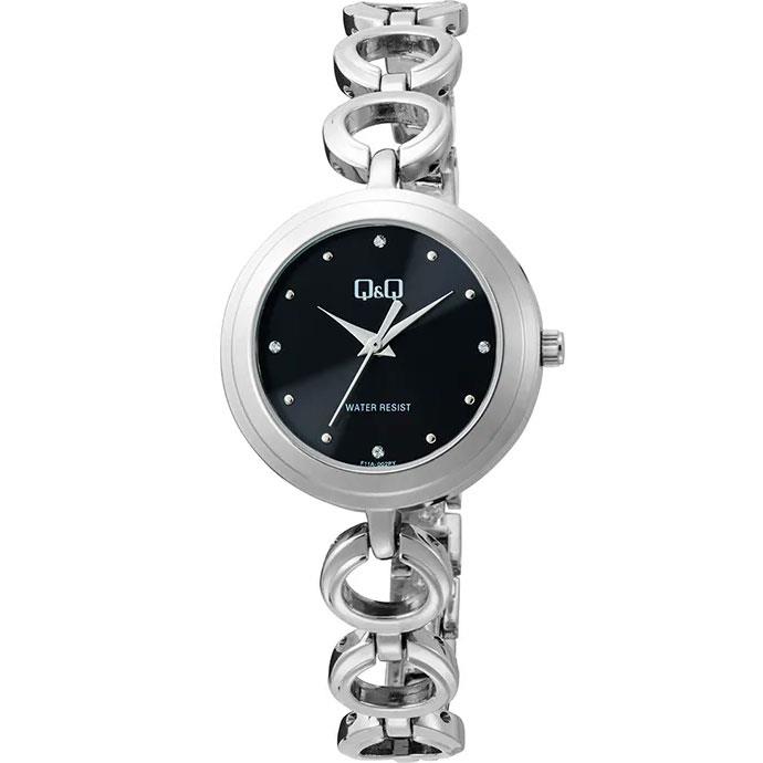 ساعت مچی زنانه کیو اند کیو QQ با طراحی روزانه بند استیل و قاب فلزی و صفحه نگین دار مشکی و موتور ژاپنی با انرژی باطری و مقاوم در برابر آب تا عمق 30 متر به همراه یک سال گارانتی شرکتی