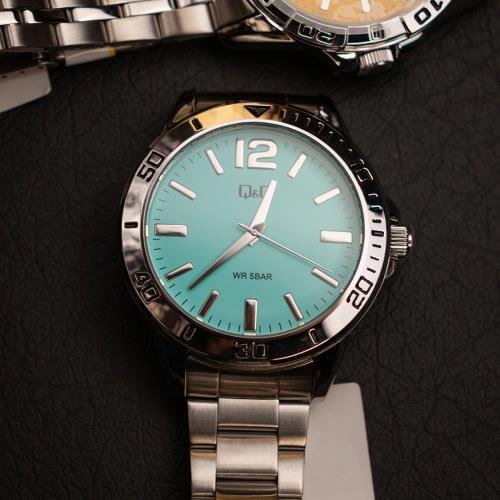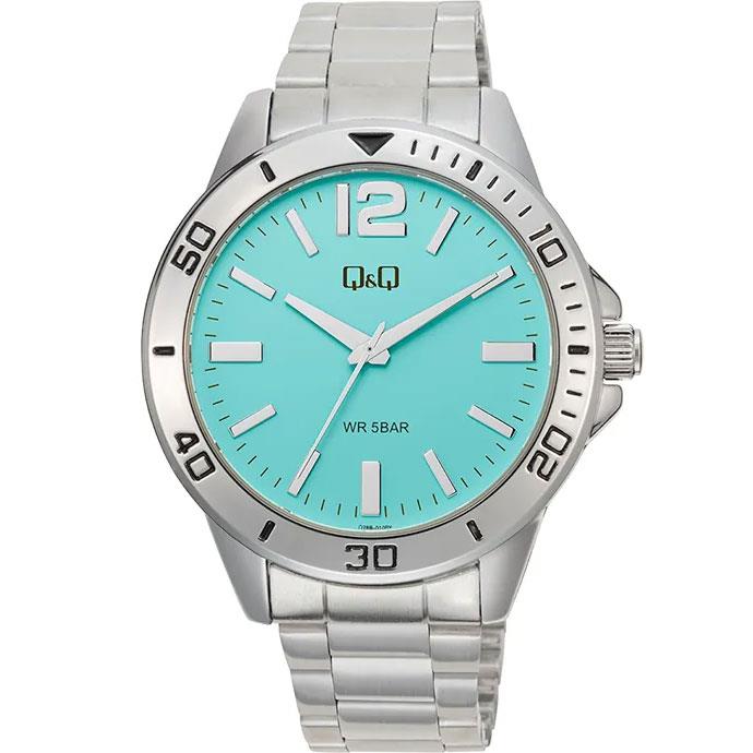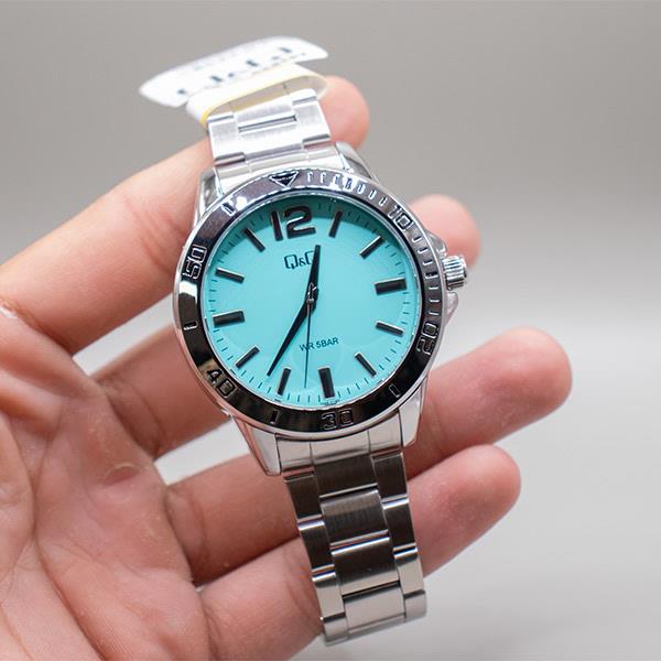 ساعت مچی مردانه کیو اند کیو QQ با طراحی روزانه بند استیل و قاب گرد نقره ای و صفحه گرد آبی و موتور ژاپنی با انرژی باطری و مقاوم در برابر آب تا عمق 50 متربه همراه یک سال گارانتی شرکتی