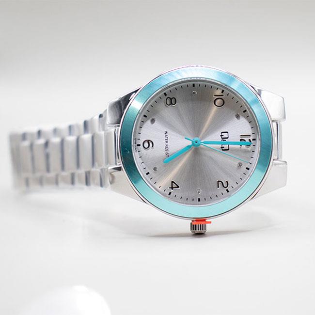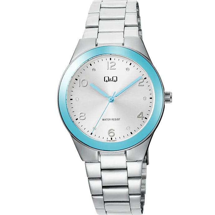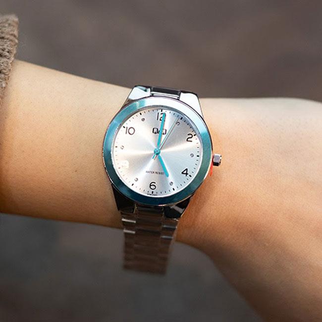 ساعت مچی زنانه کیو اند کیو QQ با طراحی روزانه بند استیل و قاب آبی فلزی و صفحه نگین دار نقره ای و موتور ژاپنی با انرژی باطری و مقاوم در برابر آب تا عمق 30 متر به همراه یک سال گارانتی شرکتی