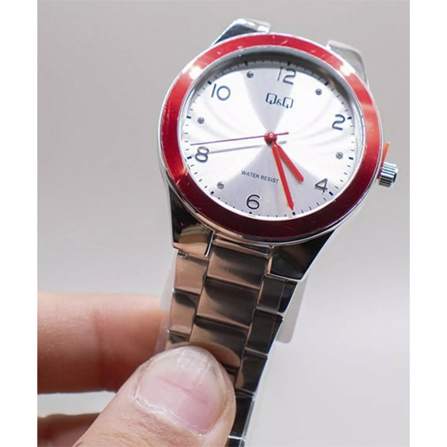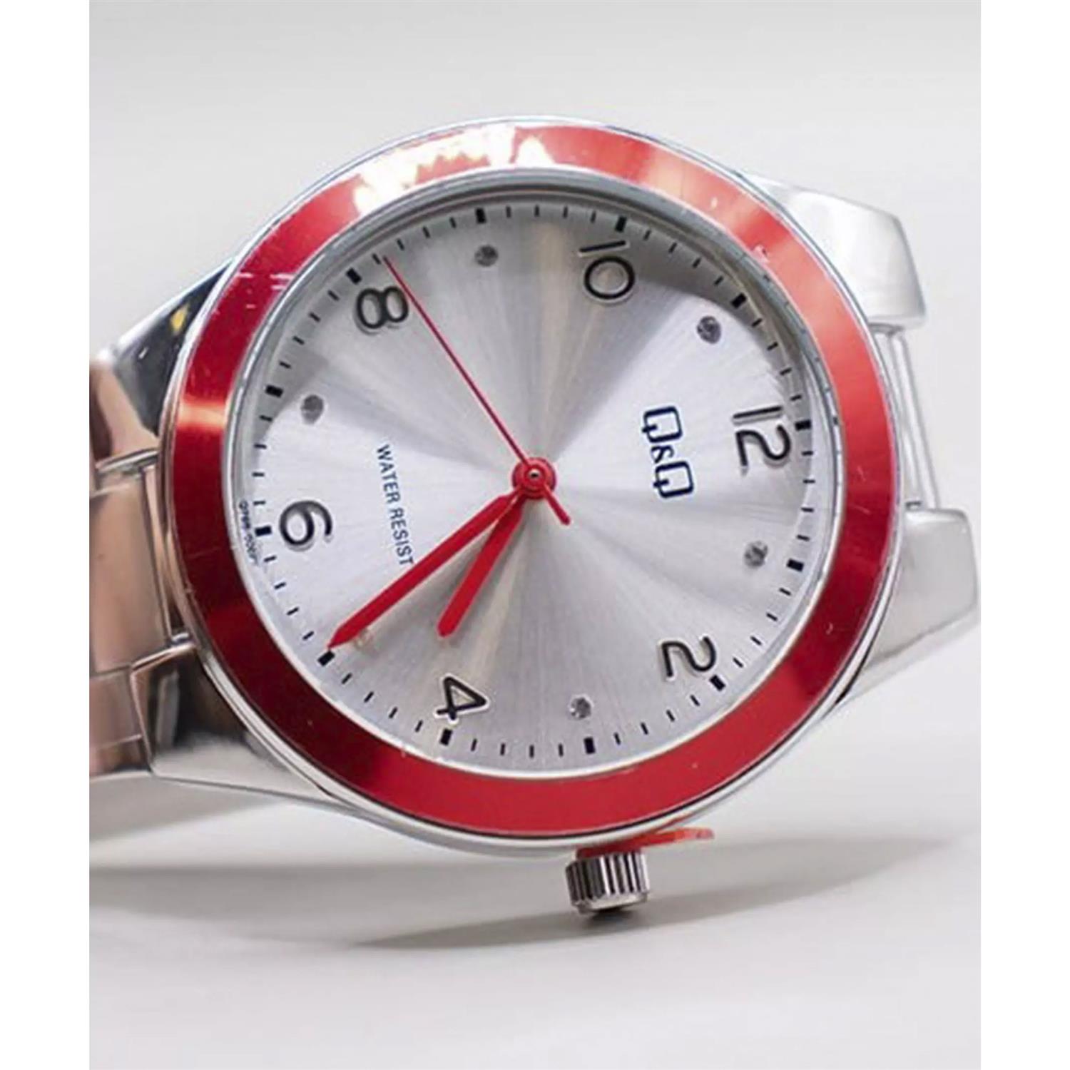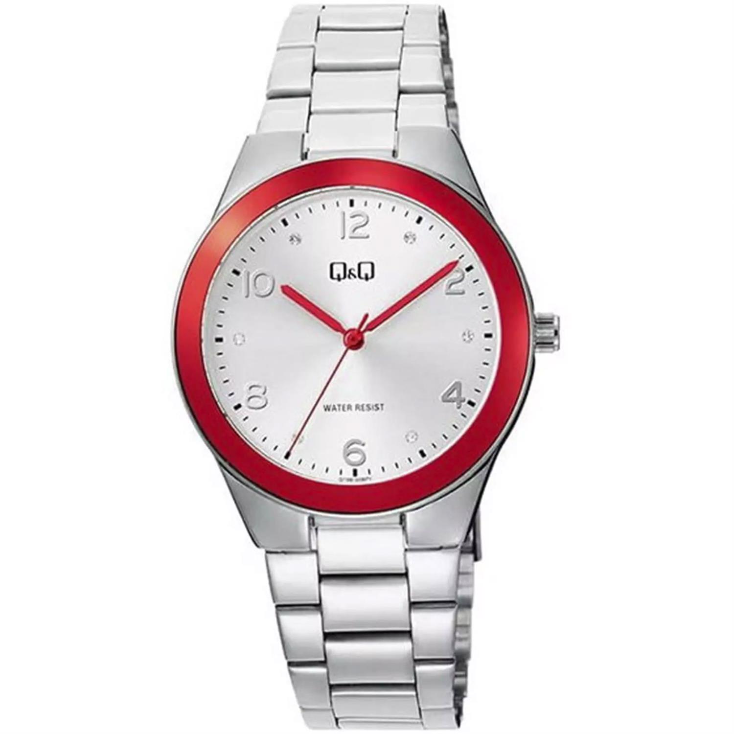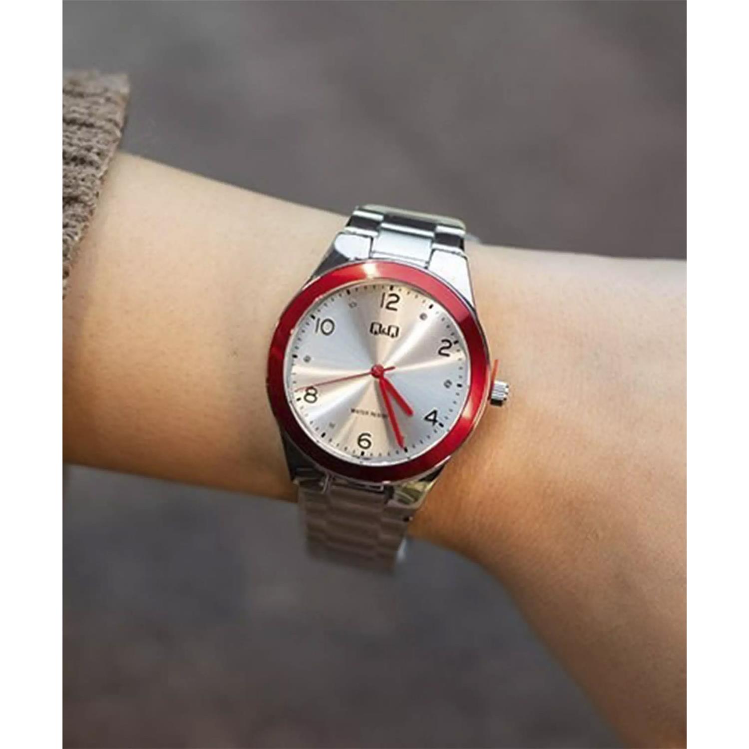 ساعت مچی زنانه کیو اند کیو QQ با طراحی روزانه بند استیل و قاب قرمزفلزی و صفحه نگین دار نقره ای و موتور ژاپنی با انرژی باطری و مقاوم در برابر آب تا عمق 30 متر به همراه یک سال گارانتی شرکتی