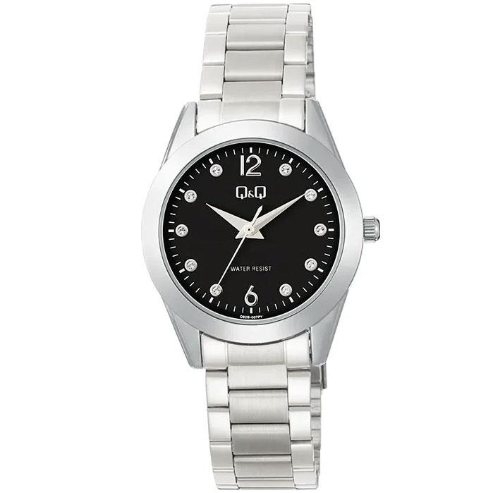 ساعت مچی زنانه کیو اند کیو QQ با طراحی روزانه بند استیل و قاب فلزی نقره ای و صفحه نگین دار مشکی و موتور ژاپنی با انرژی باطری و مقاوم در برابر آب تا عمق 30 متر به همراه یک سال گارانتی شرکتی
