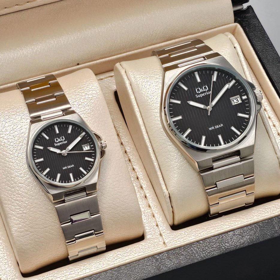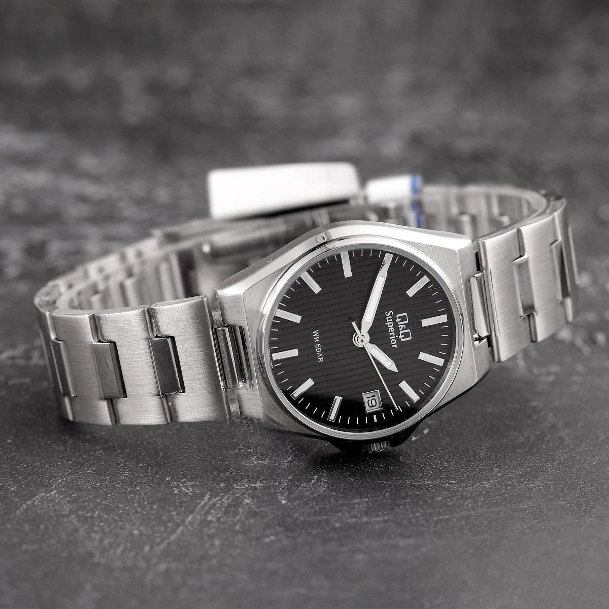 ساعت مچی زنانه کیو اند کیو QQ با طراحی روزانه بند استیل و قاب گرد استیل و صفحه گرد مشکی با قابلیت داشتن تقویم / شب نما و موتور ژاپنی با انرژی باطری و مقاوم در برابر آب تا عمق 50 متر به همراه یک سال گارانتی شرکتی