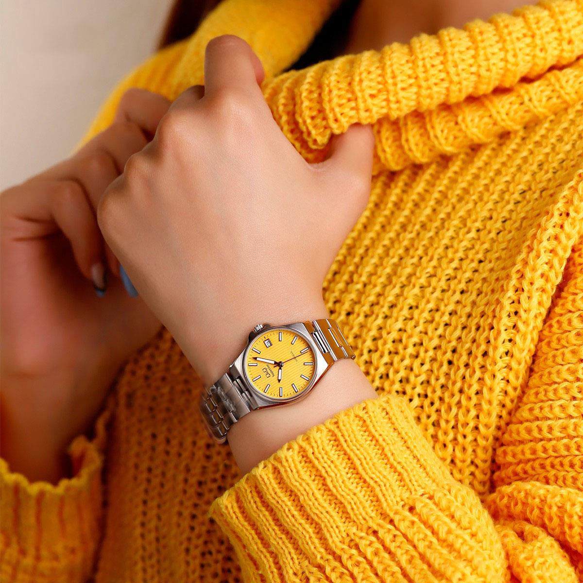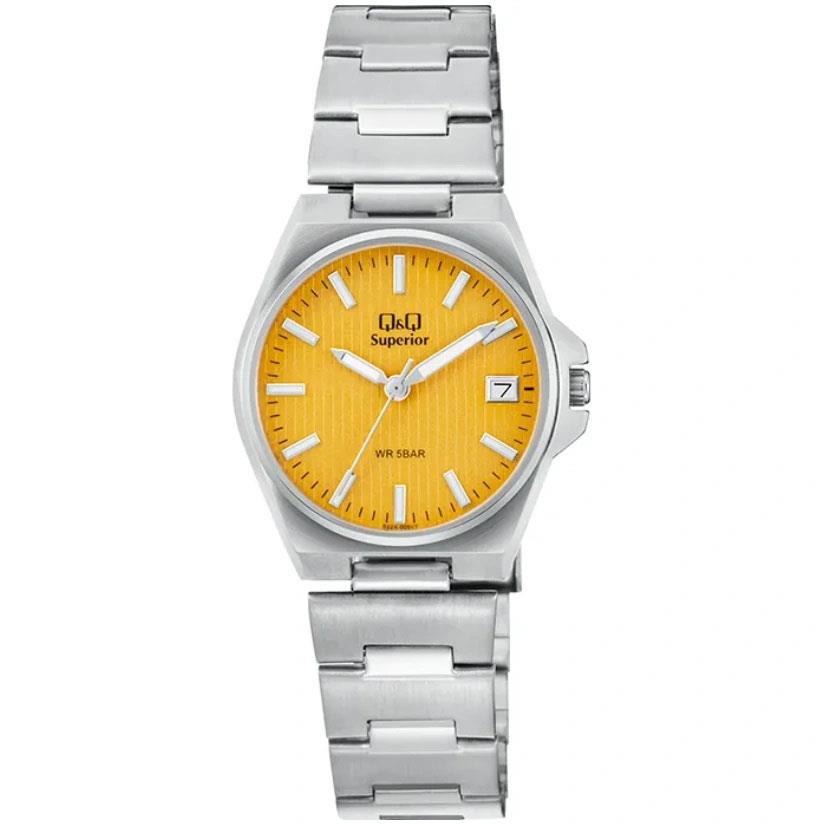 ساعت مچی زنانه کیو اند کیو QQ با طراحی روزانه بند استیل و قاب گرد استیل و صفحه گرد زرد با قابلیت داشتن تقویم / شب نما و موتور ژاپنی با انرژی باطری و مقاوم در برابر آب تا عمق 50 متر به همراه یک سال گارانتی شرکتی