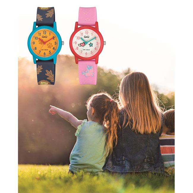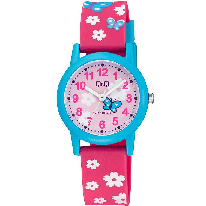 ساعت مچی دخترانه کیو اند کیو QQ با طراحی روزانه بند سیلیکونی طرحدار سرخابی و قاب گرد آبی و صفحه طرحدار صورتی و موتور ژاپنی با انرژی باطری و مقاوم در برابر آب تا عمق 100 متر به همراه یک سال گارانتی شرکتی
