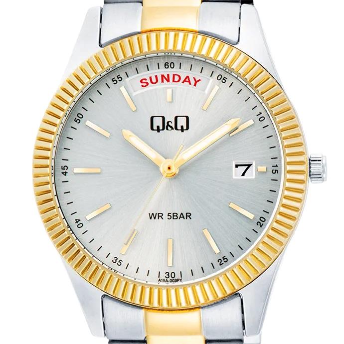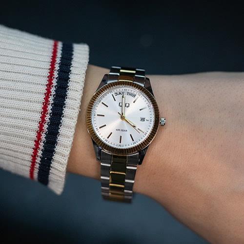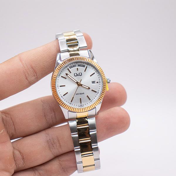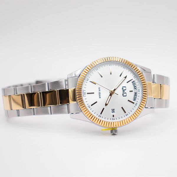 ساعت مچی زنانه کیو اند کیو QQ با طراحی روزانه بند استیل طلایی و قاب گرد دو رنگ و صفحه گرد نقره ای با قابلیت داشتن تقویم روزهای هفته شب نما و موتور ژاپنی با انرژی باطری و مقاوم در برابر آب تا عمق 50 متر به همراه یک سال گارانتی شرکتی