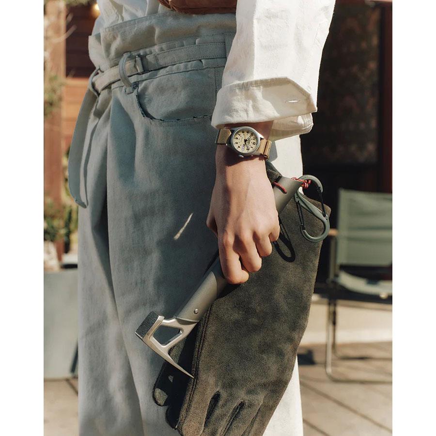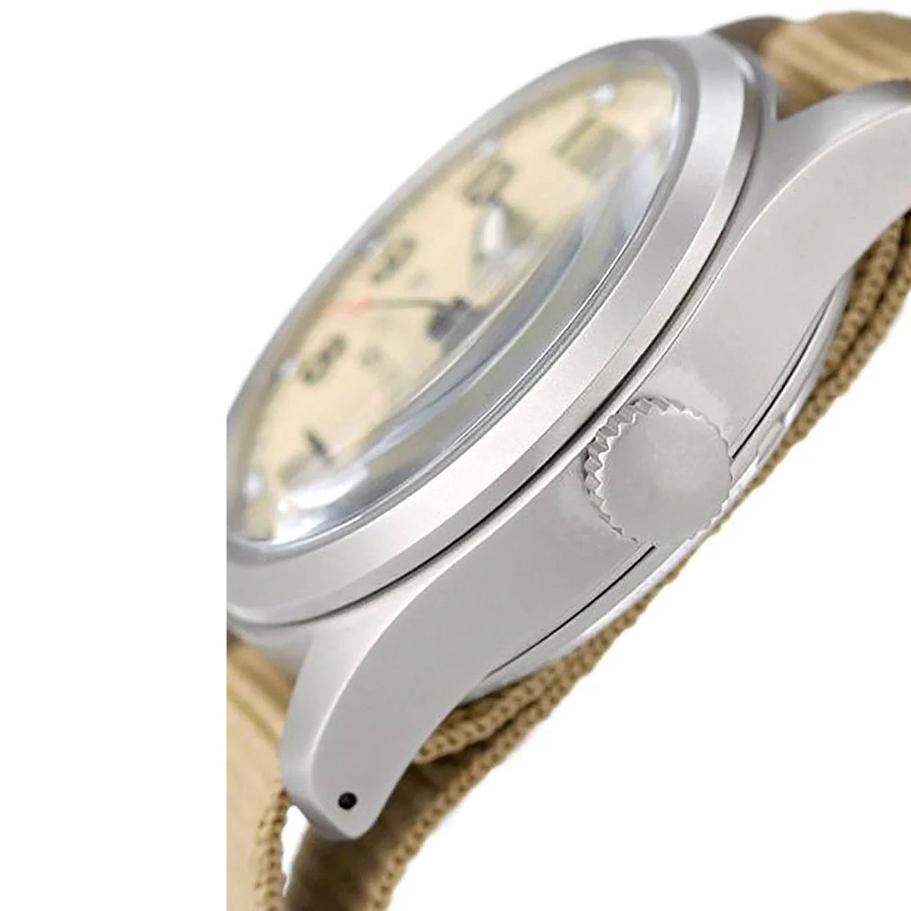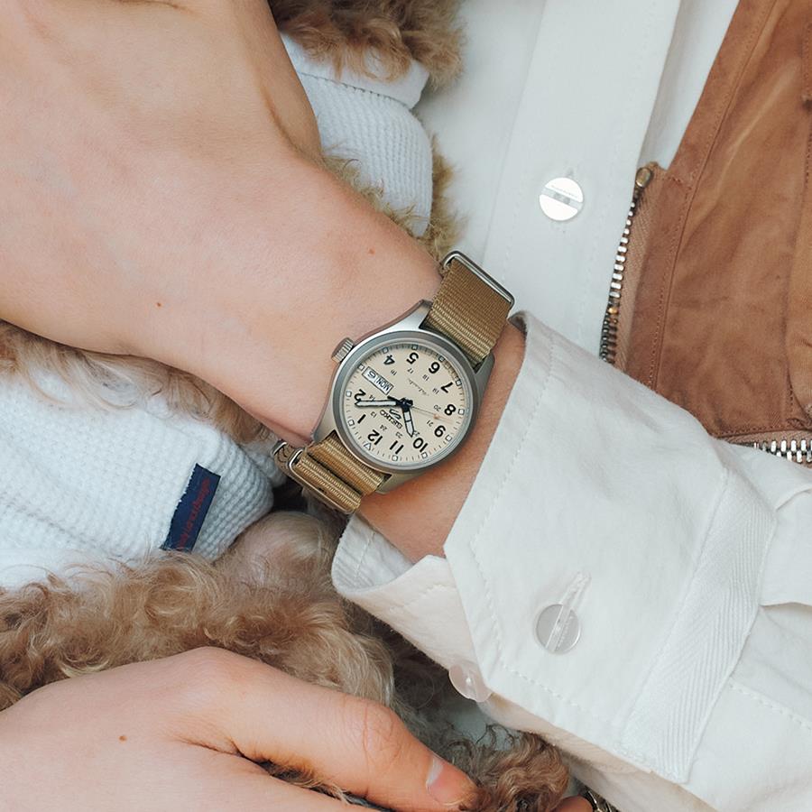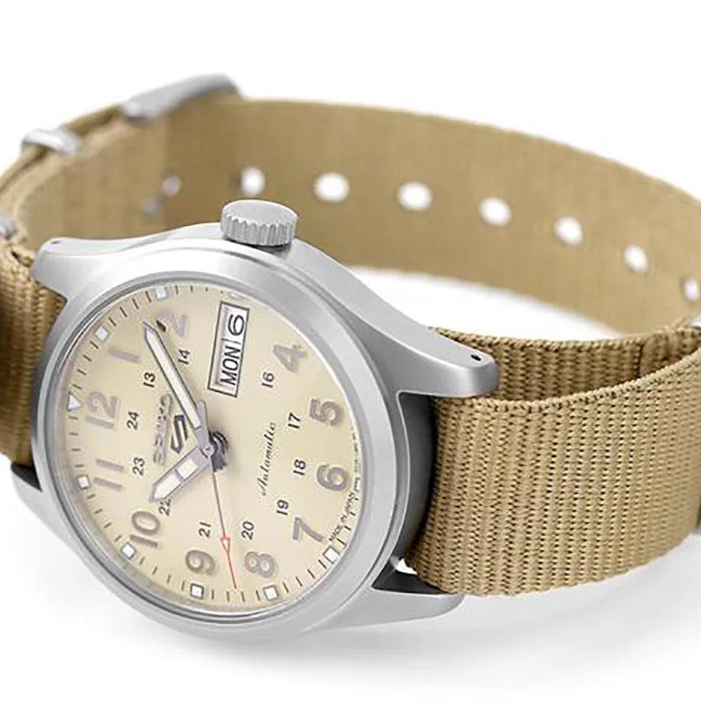 ساعت مچی مردانه سیکو seiko با طراحی روزانه بند برزنتی کرم , قاب گرد استیل و صفحه گرد کرم با  قابلیت داشتن تقویم / روزهای هفته/ شب نماو موتوراتوماتیک ژاپنی با انرژی مکانیکی و مقاوم در برابر آب تا عمق 100 متر به همراه گارانتی بین المللی