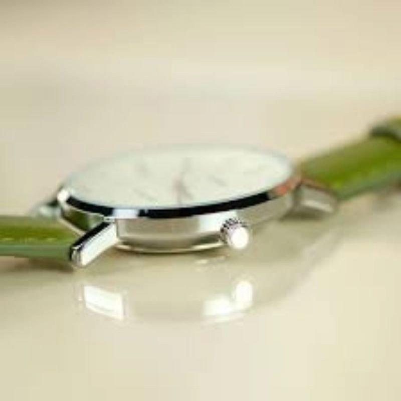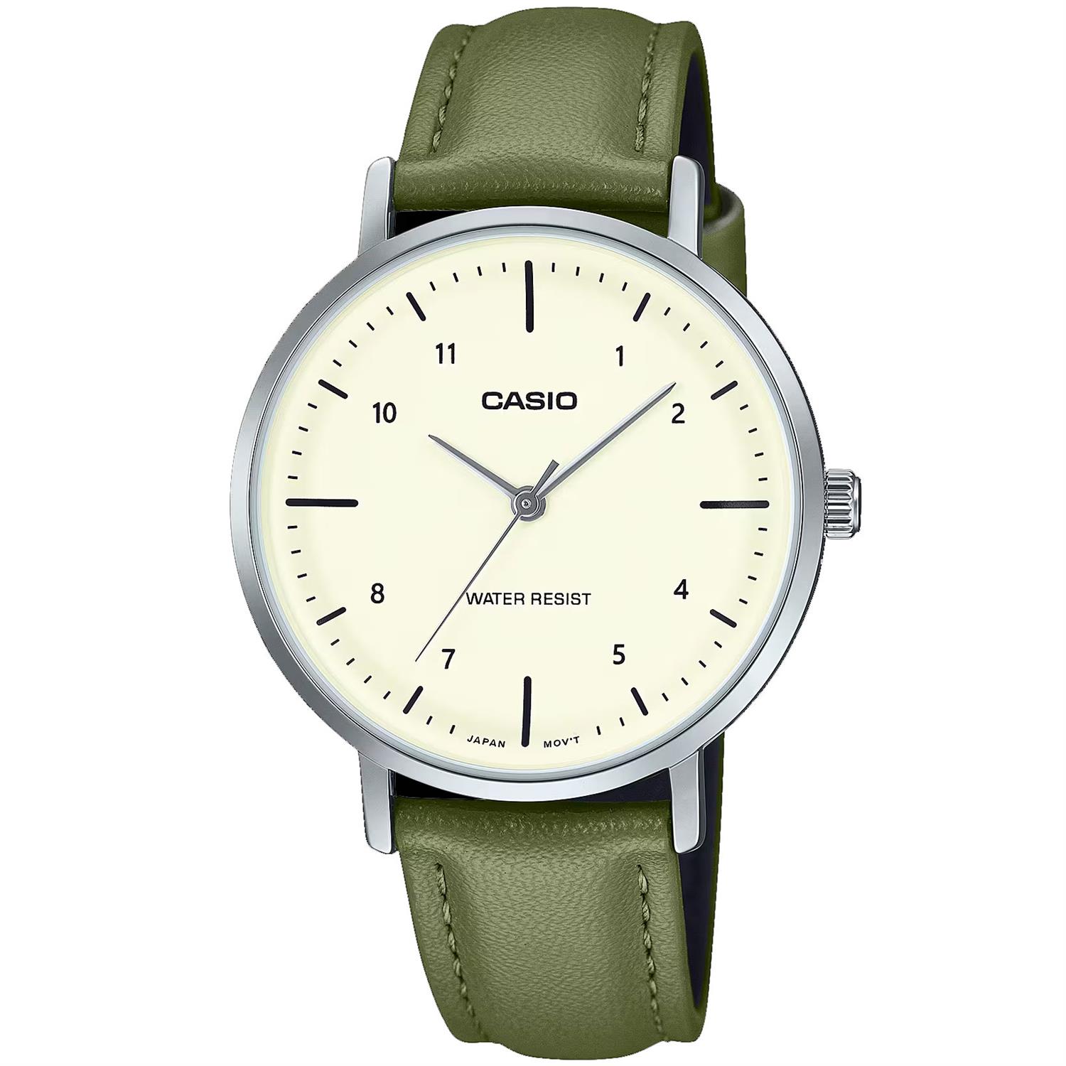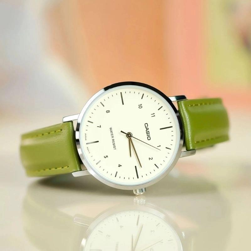 ساعت مچی زنانه کاسیو casio با طراحی روزانه بند چرمی سبز با قاب فلزی و صفحه گرد کرم و موتور ژاپنی با انرژی باتری و مقاوم در برابر آب تا عمق 30 متر به همراه گارانتی بین المللی