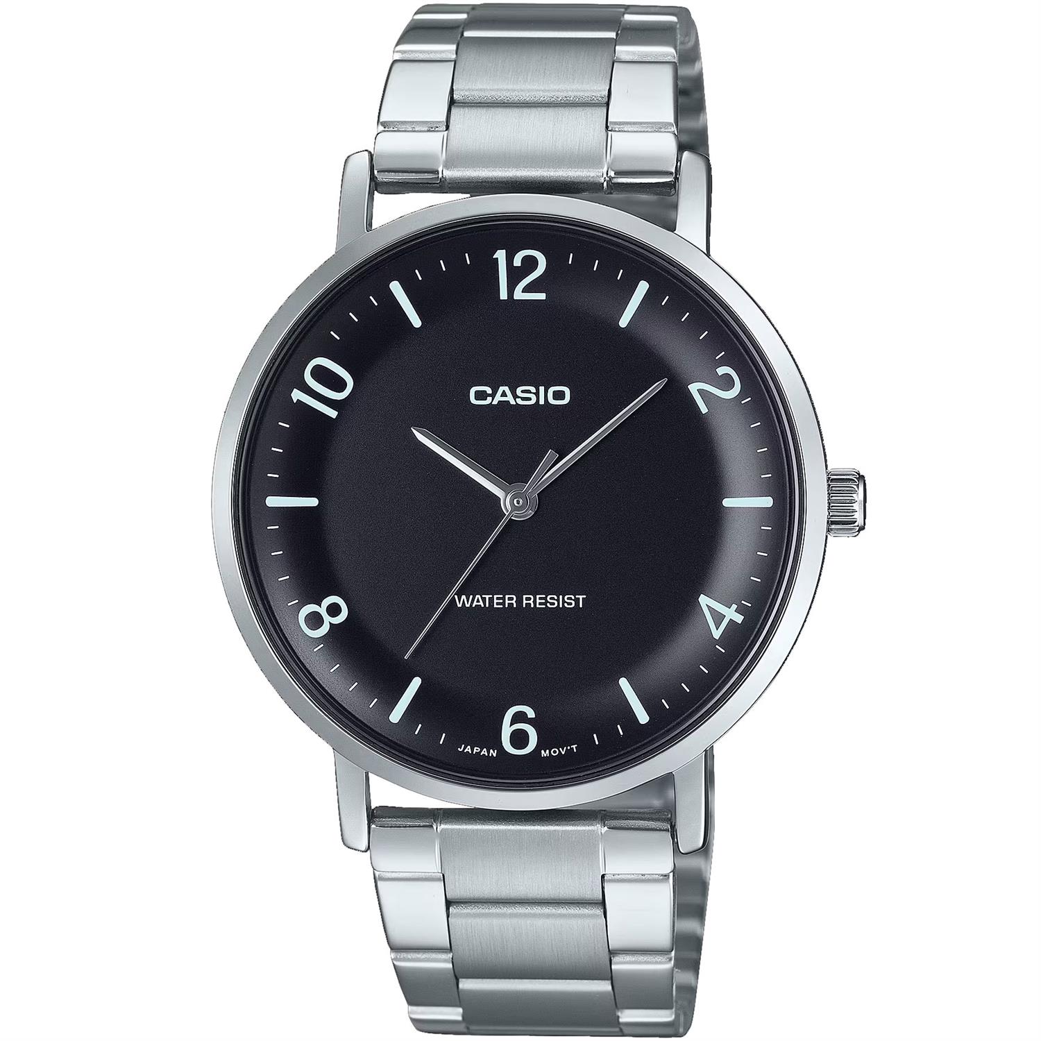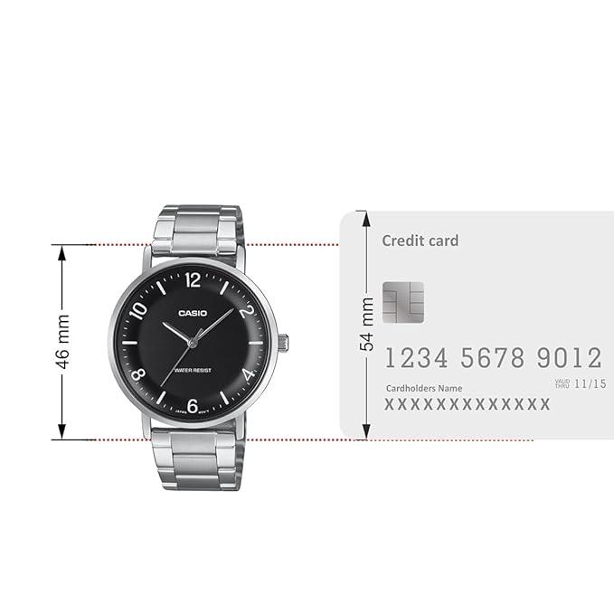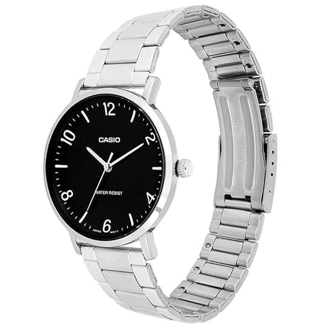 ساعت مچی مردانه کاسیو casio با طراحی روزانه بند استیل با قاب فلزی استیل و صفحه گرد مشکی و موتور ژاپنی با انرژِی باتری و مقاوم در برابر آب تا عمق 30 متر به همراه گارانتی بین المللی