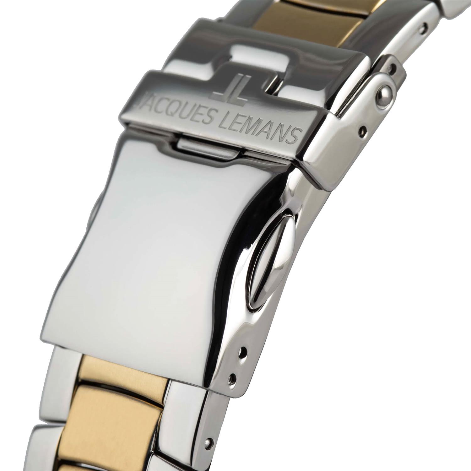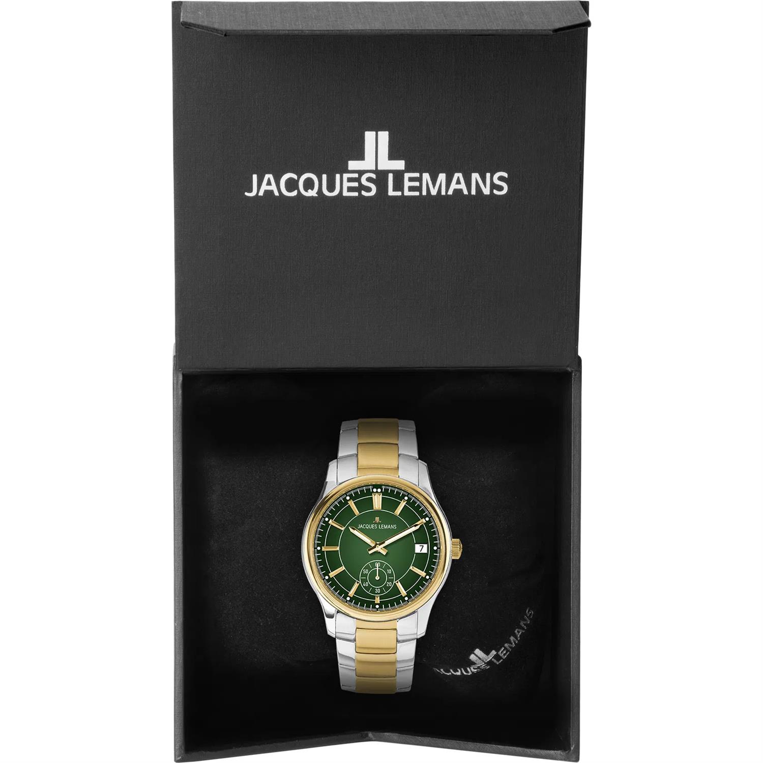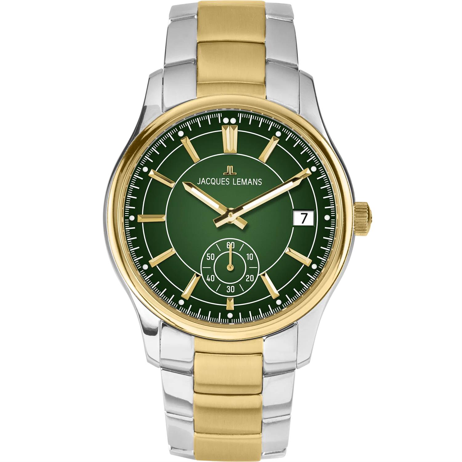 ساعت مچی مردانه ژاک لمن jacques lemans با طراحی روزانه بند دو رنگ و قاب گرد دو رنگ و صفحه گرد سبز با قابلیت داشتن تقویم , شب نما , زیر ثانیه و موتور ژاپنی با انرژی باتری و مقاومت در برابر آب تا عمق 100 متر به همراه گارانتی بین المللی