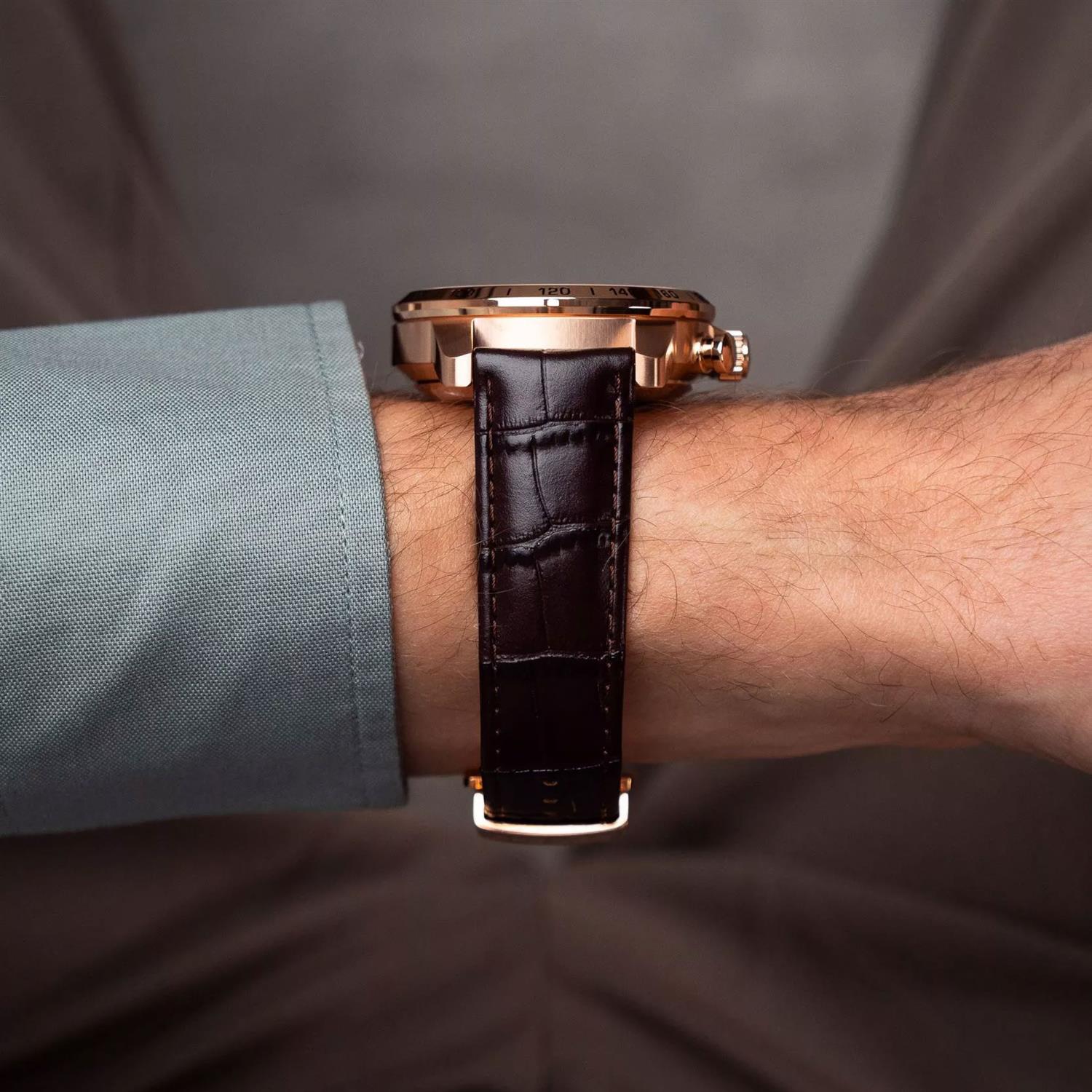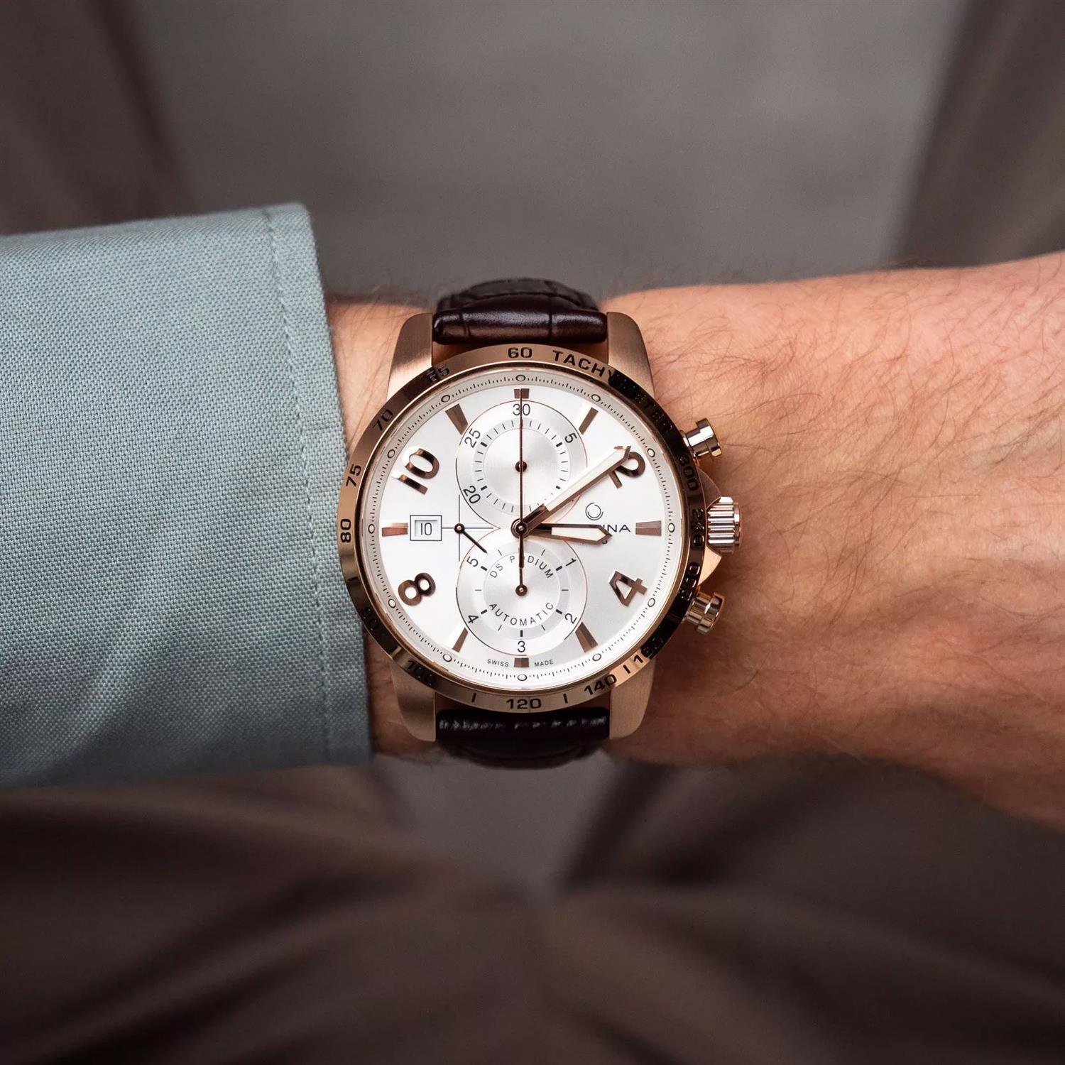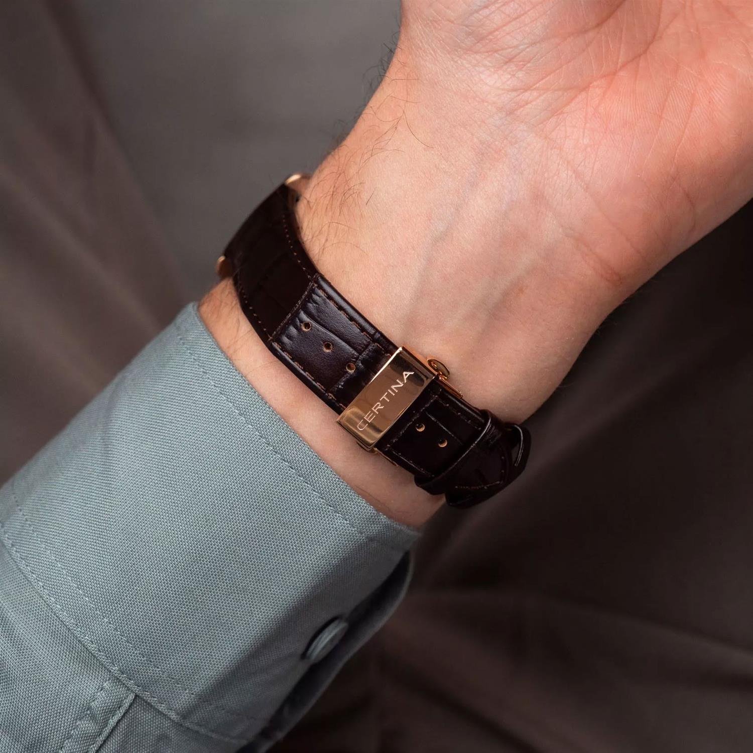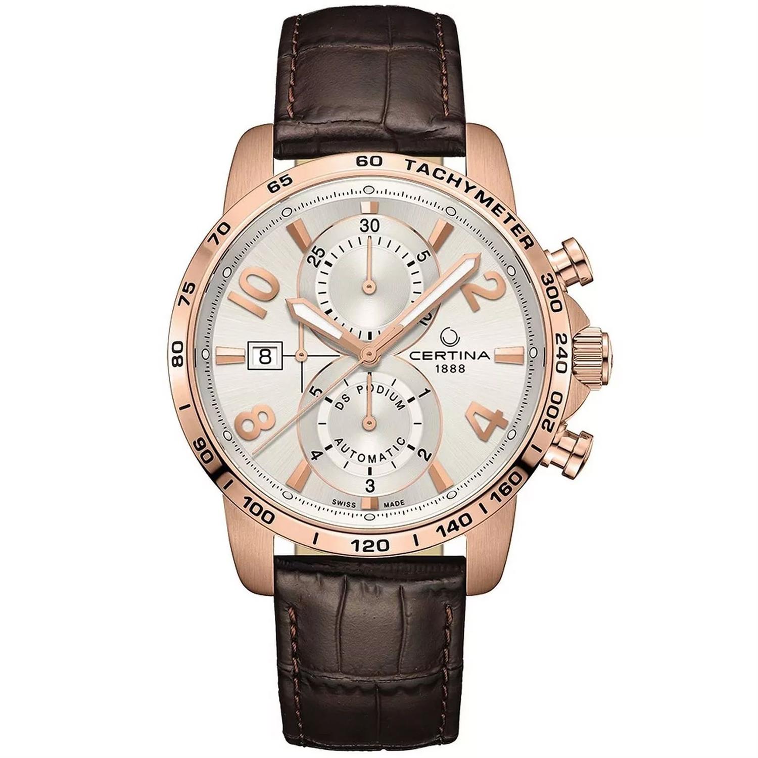 ساعت مچی مردانه سرتینا CERTINA با طراحی اسپرت بند چرمی قهوه ای / قاب فلزی مسی و صفحه گرد نقره ای با شیشه ضد خراش و ضد انعکاس نور و موتوراتوماتیک سویییسی با انرژی مکانیکی و قابلیت داشتن تقویم / شب نما / زه تاچی متر / کرنوگراف و مقاوم در برابر آب تا عمق 100 متر به همراه  گارانتی بین المللی