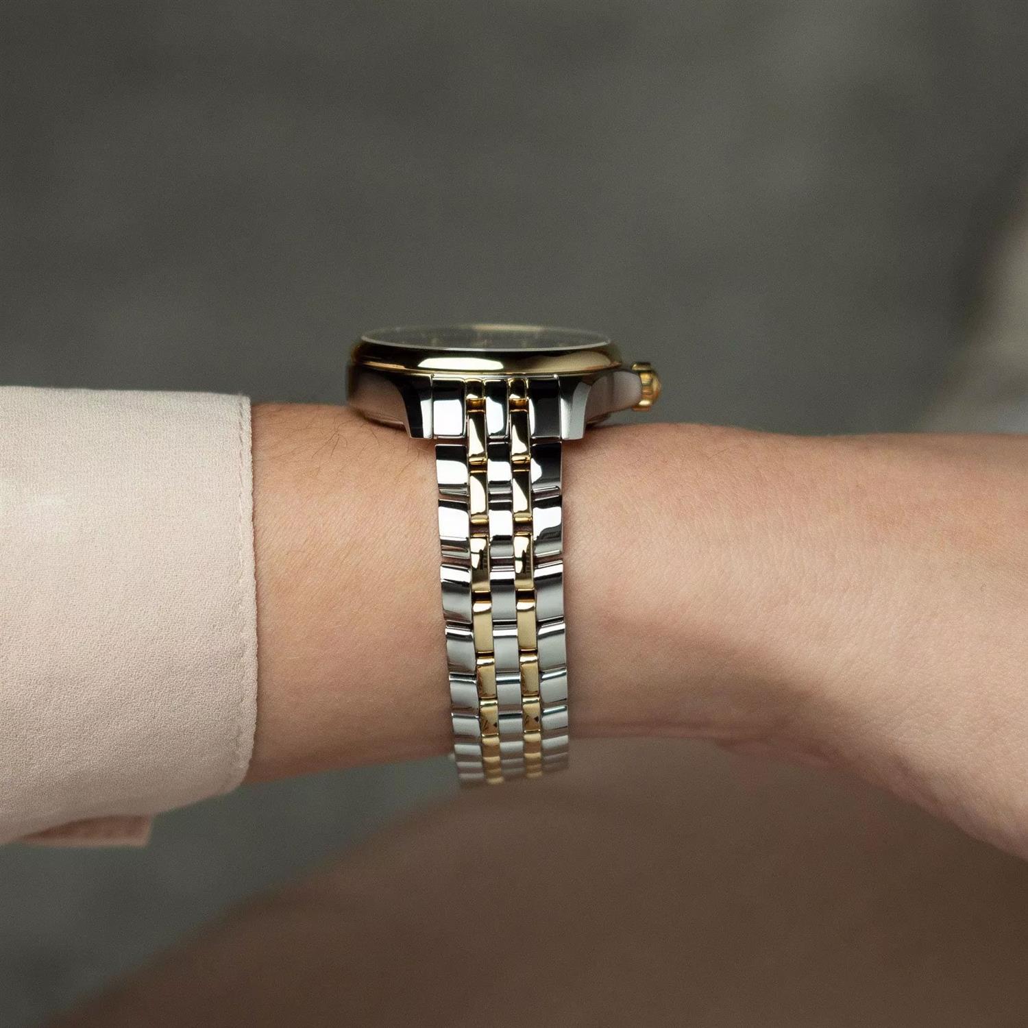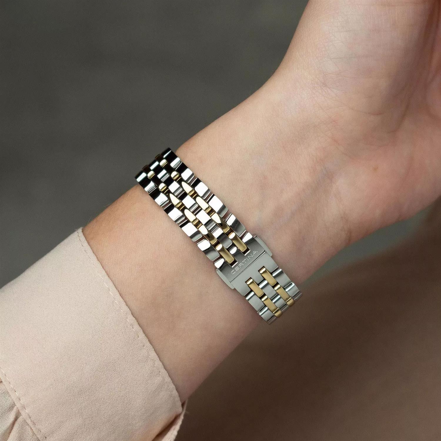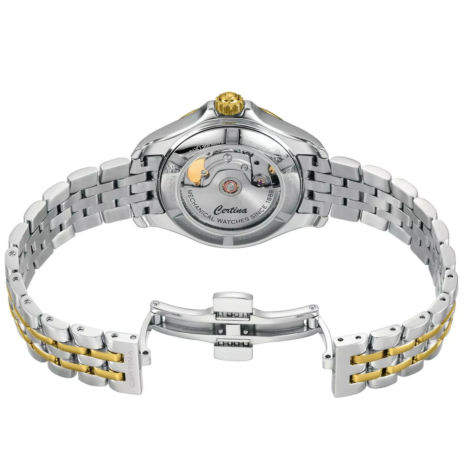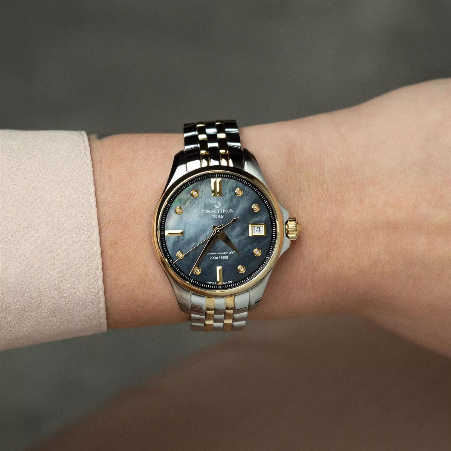 ساعت مچی زنانه سرتینا CERTINA با طراحی اسپرت بند طلایی استیل/ قاب گرد طلایی استیل و صفحه گرد سرمه ای صدفی نگین دار با شیشه ضد خراش و ضد انعکاس نور و موتوراتوماتیک سویییسی با انرژی مکانیکی و قابلیت داشتن تقویم و مقاوم در برابر آب تا عمق 200 متر به همراه  گارانتی بین المللی