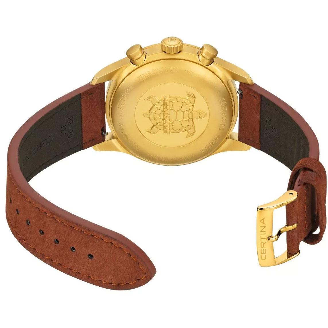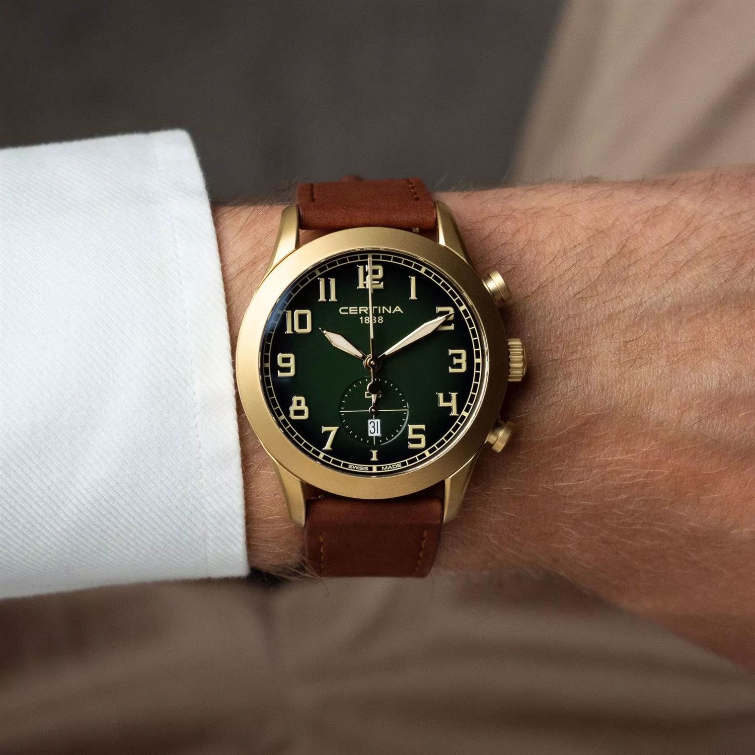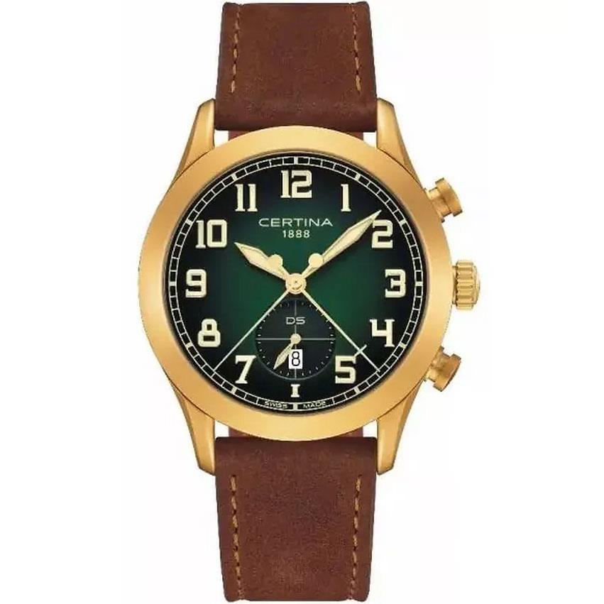 ساعت مچی مردانه سرتینا CERTINA با طراحی اسپرت بند چرمی قهوه ای / قاب گرد طلایی و صفحه گرد سبز با شیشه ضد خراش و ضد انعکاس نور و موتور سویییسی با انرژی باتری و قابلیت داشتن تقویم / شب نما / زیرثانیه/کرنوگراف و مقاوم در برابر آب تا عمق 100 متر به همراه  گارانتی بین المللی