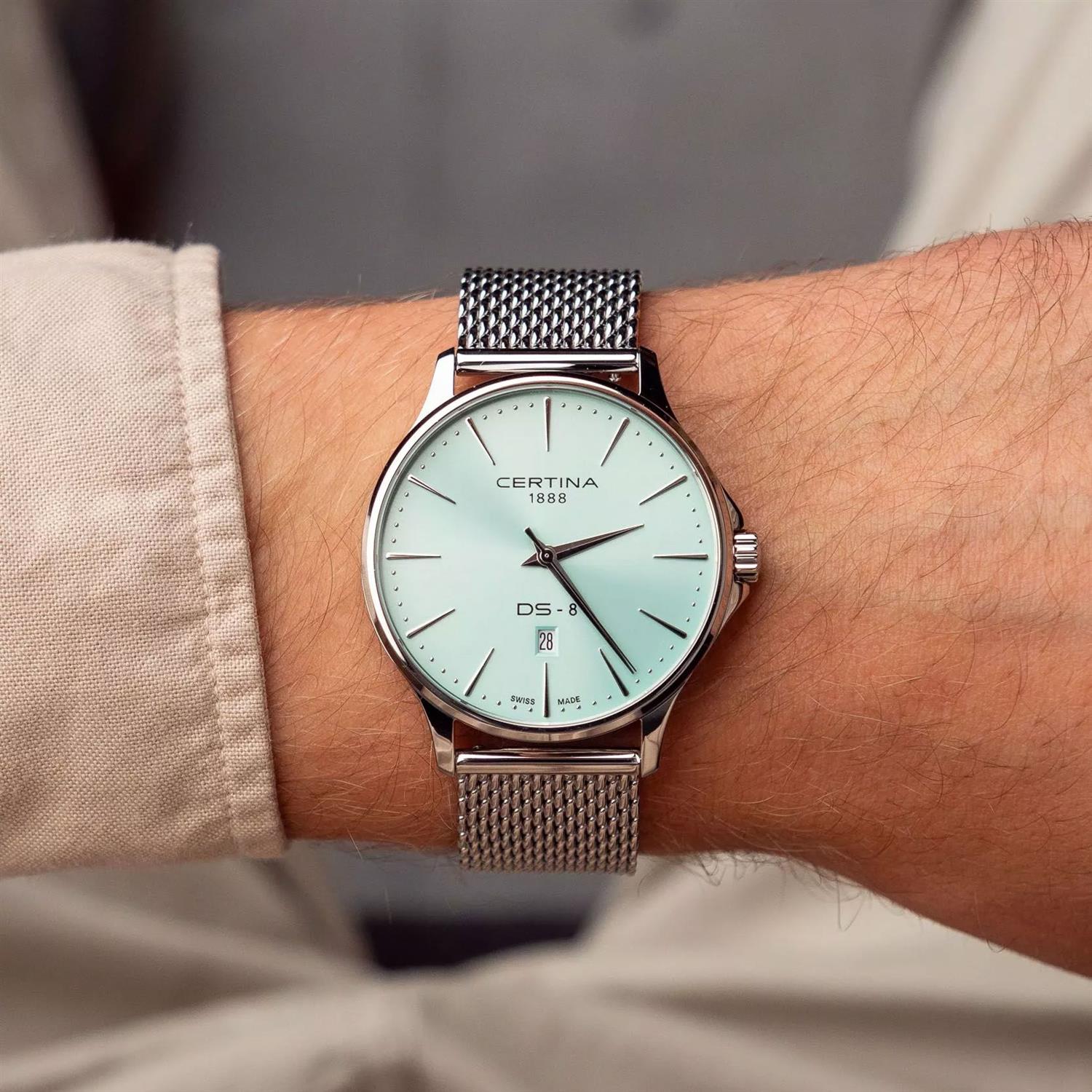 ساعت مچی مردانه سرتینا CERTINA با طراحی اسپرت بند حصیر بافت استیل/ قاب گرد استیل و صفحه گرد سبز رنگ با شیشه ضد خراش و ضد انعکاس نور و موتور سویییسی با انرژی باتری و قابلیت داشتن تقویم / شب نما / کرنوگراف و مقاوم در برابر آب تا عمق 100 متر به همراه  گارانتی بین المللی