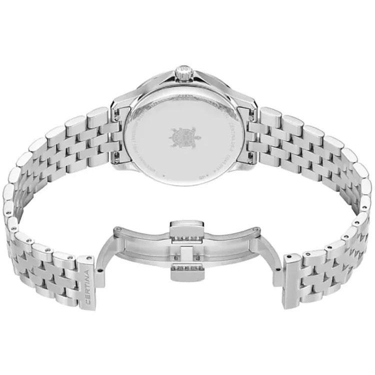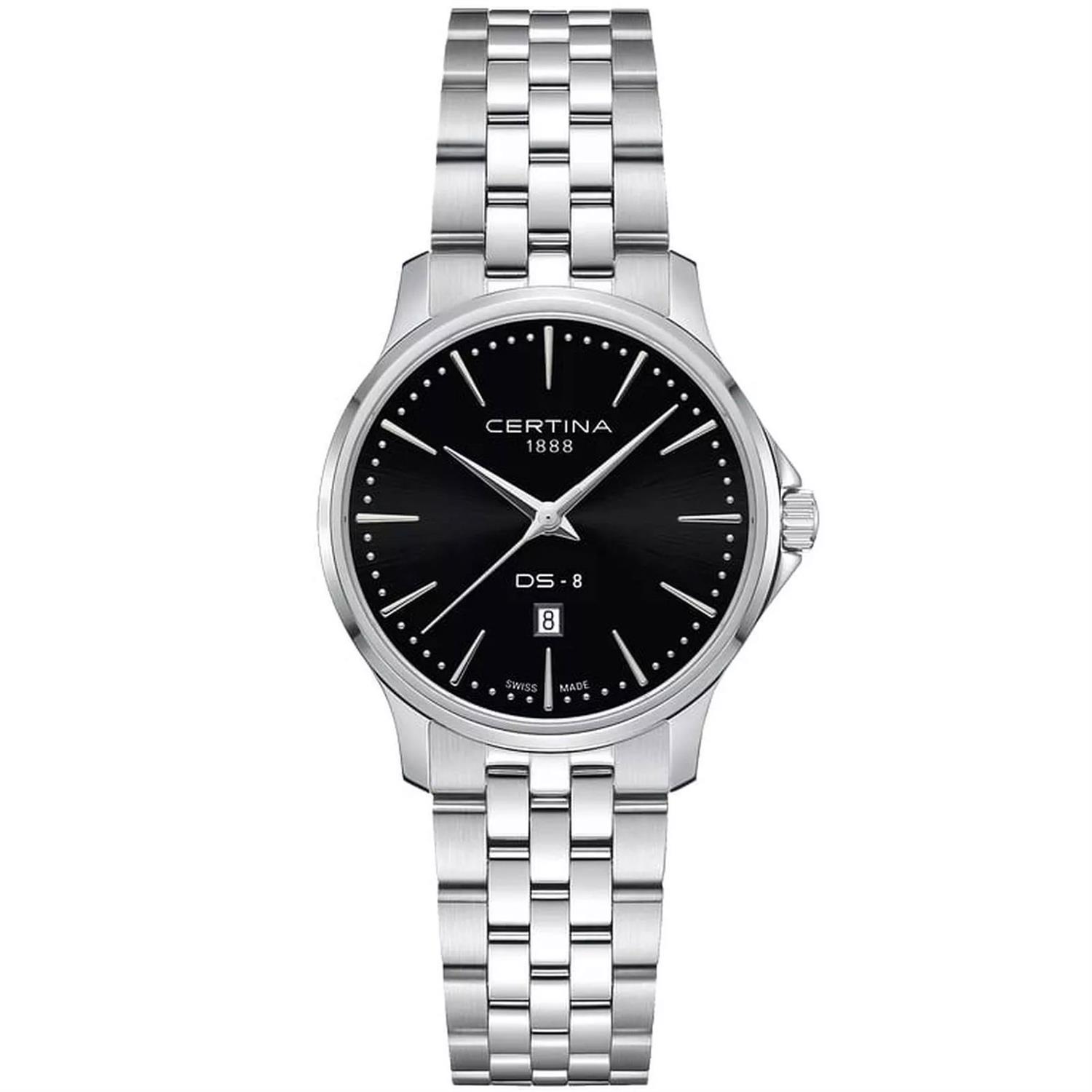 ساعت مچی زنانه سرتینا CERTINA با طراحی روزانه بند استیل/ قاب گرد استیل و صفحه گرد مشکی با شیشه ضد خراش و ضد انعکاس نور و موتورسویییسی با انرژی باتری و قابلیت داشتن تقویم و مقاوم در برابر آب تا عمق 100 متر به همراه  گارانتی بین المللی