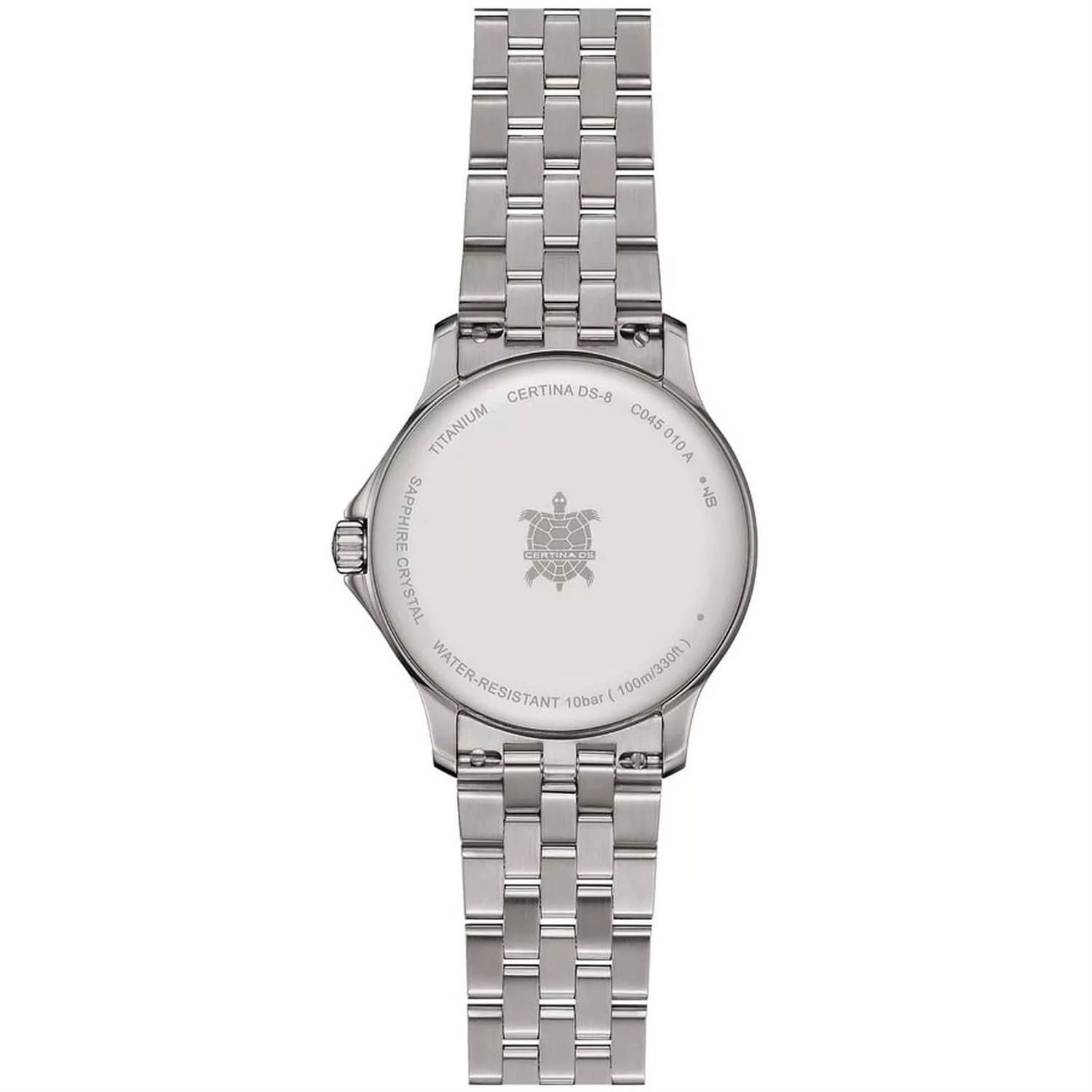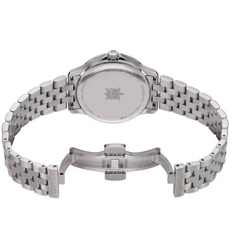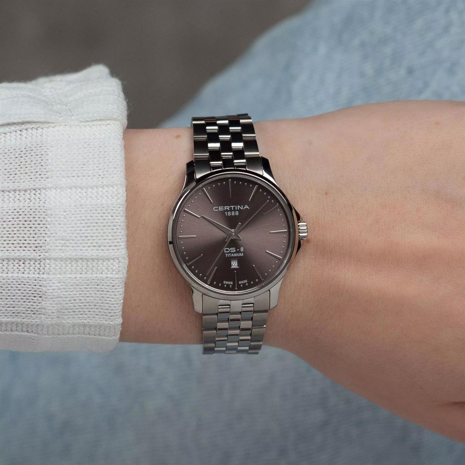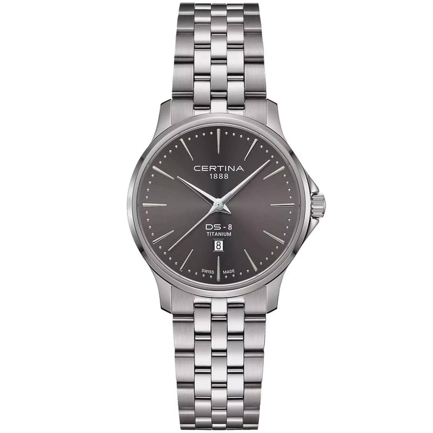 ساعت مچی زنانه سرتینا CERTINA با طراحی روزانه بند تیتانیومی طوسی/ قاب طوسی و صفحه گرد طوسی با شیشه ضد خراش و ضد انعکاس نور و موتور سویییسی با انرژی باتری و قابلیت داشتن تقویم و مقاوم در برابر آب تا عمق 100 متر به همراه  گارانتی بین الملی