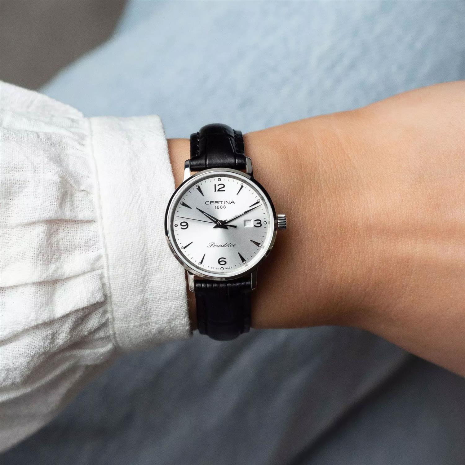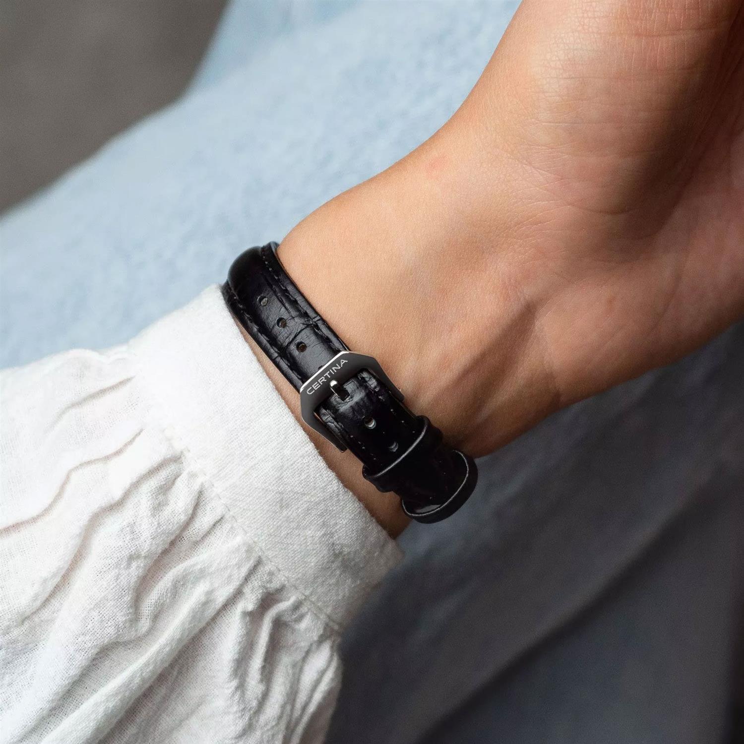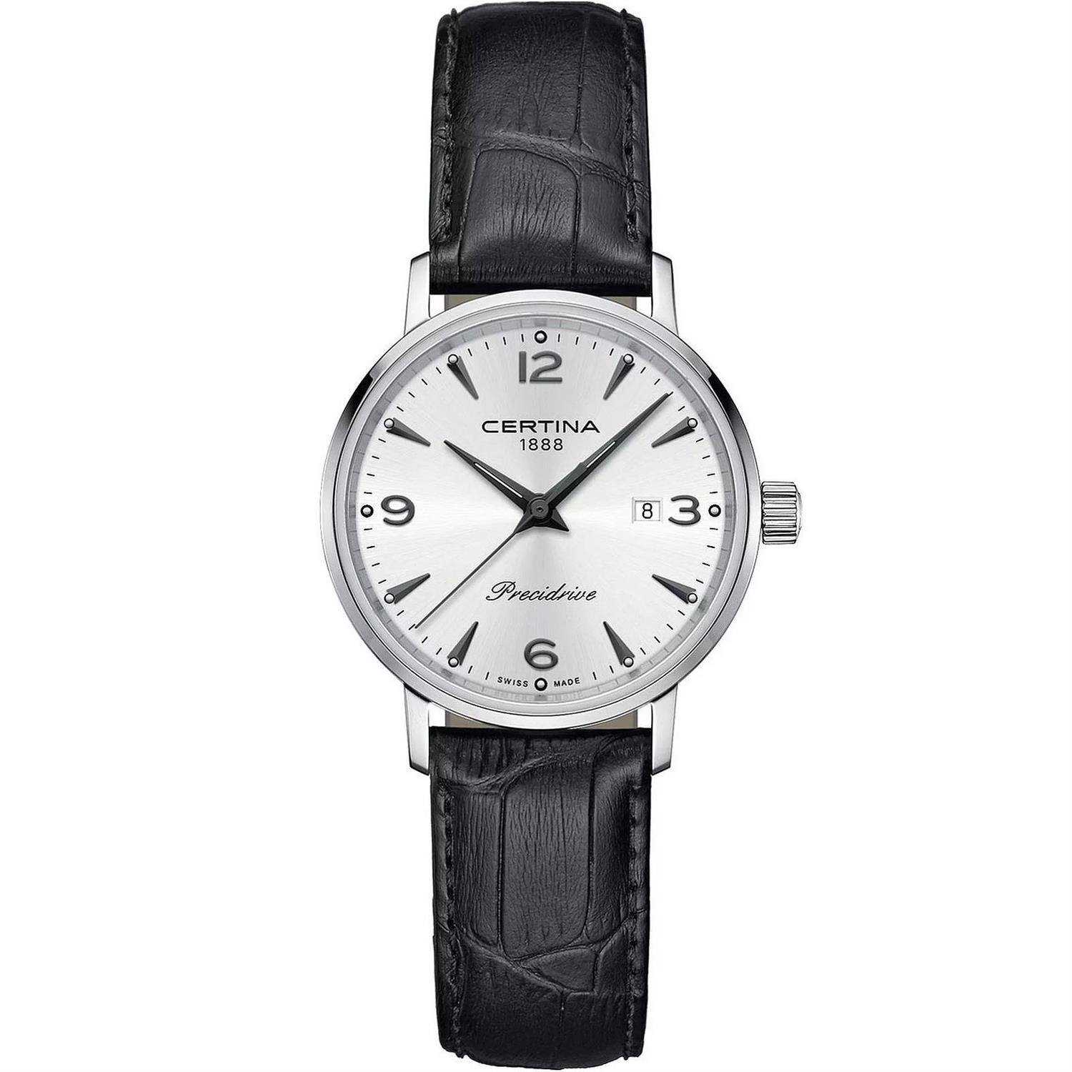 ساعت مچی زنانه سرتینا CERTINA با طراحی اسپرت بند چرمی مشکی / قاب استیل و صفحه گرد نقره ای با شیشه ضد خراش و ضد انعکاس نور و موتور سویییسی با انرژی باتری و قابلیت داشتن تقویم / شبنما و مقاوم در برابر آب تا عمق 100 متر به همراه  گارانتی بین المللی