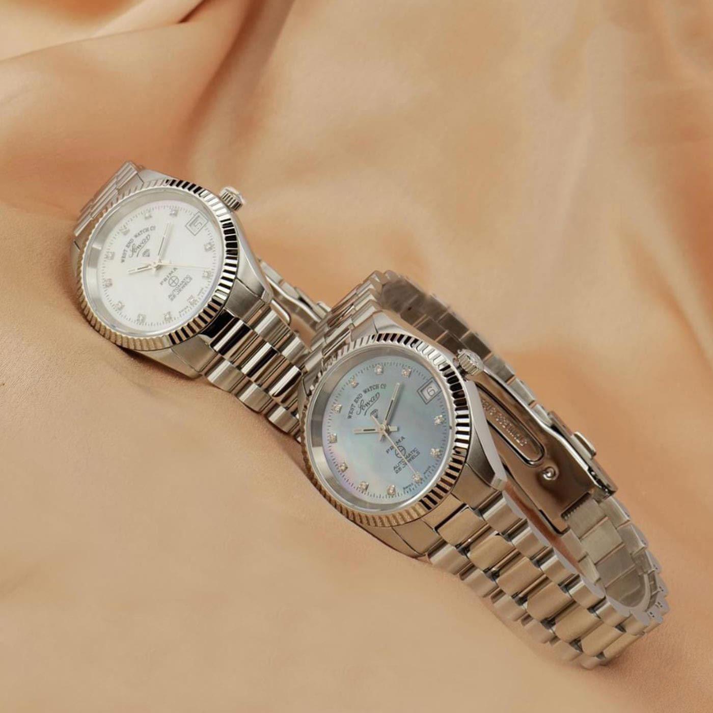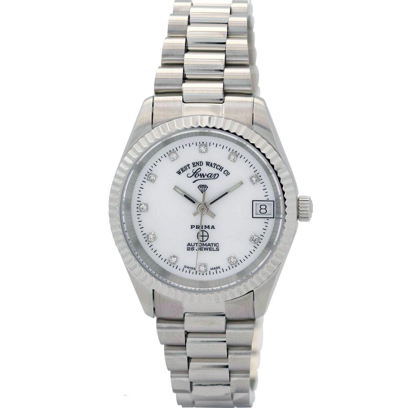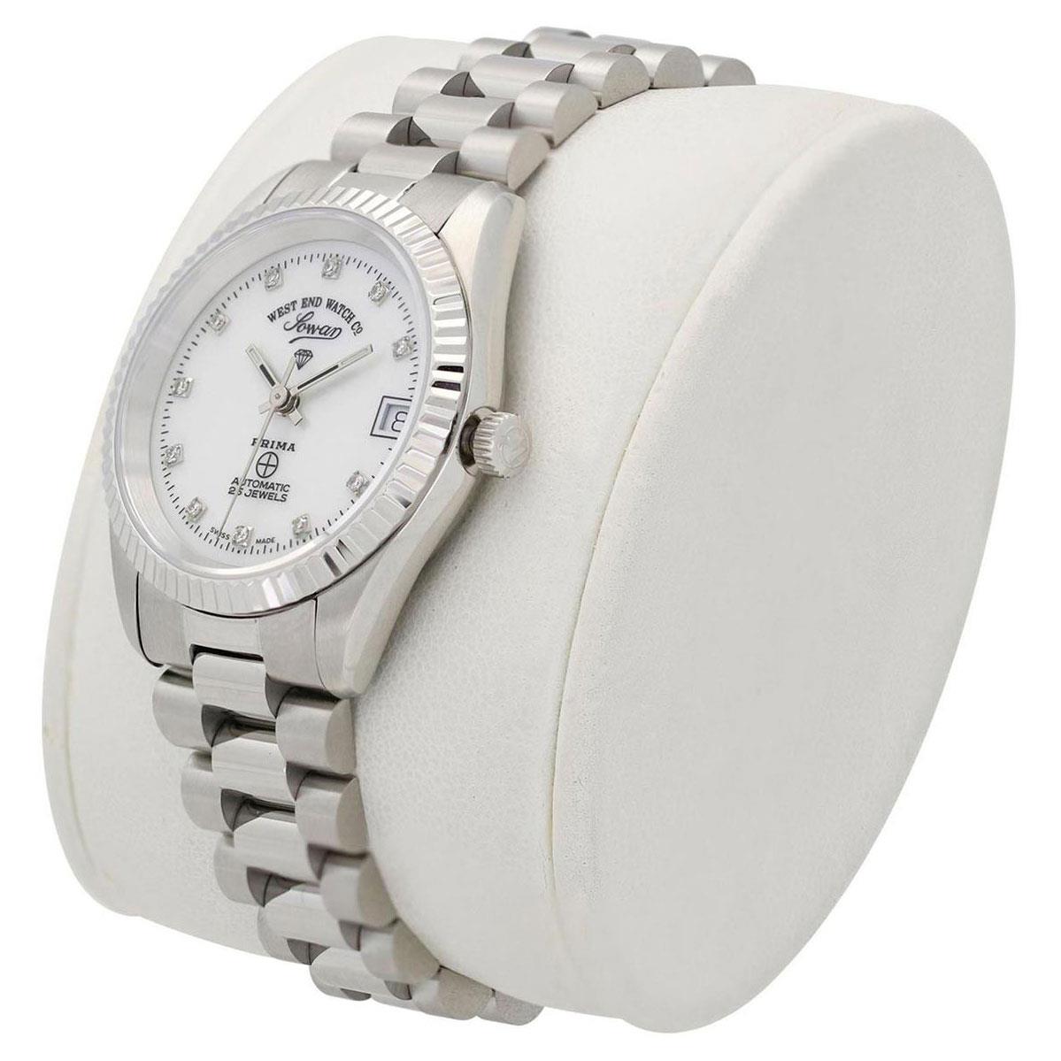 ساعت مچی زنانه وست اند واچ westendwatch با طراحی روزانه بند استیل و قاب گرد استیل با صفحه سفید نگین دار و شیشه ضد خراش با قابلیت داشتن تقویم / شب نما / روزهای هفته و موتور اتوماتیک سوییسی با انرژی مکانیکی و مقاوم در برابر آب تا عمق 50 متر به همراه گارانتی بین المللی