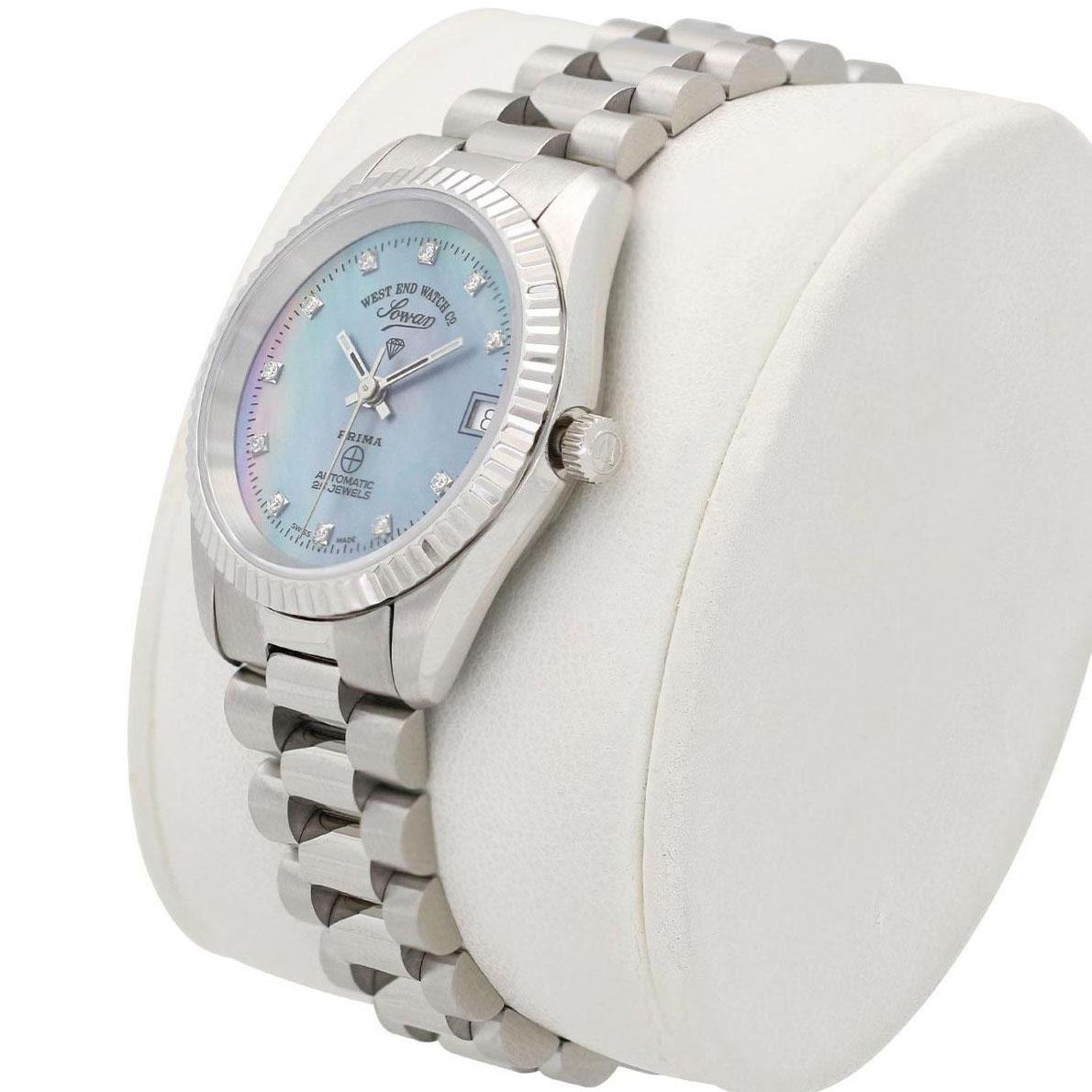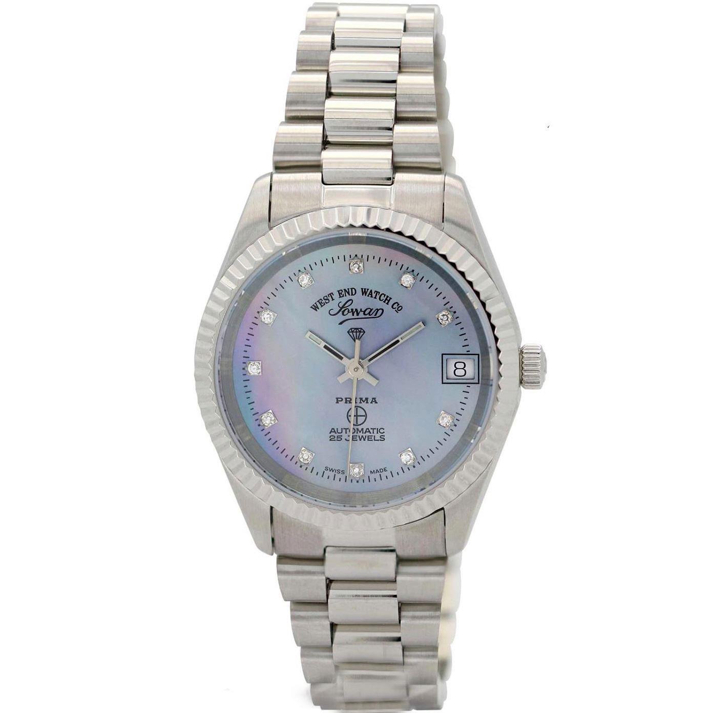 ساعت مچی زنانه وست اند واچ westendwatch با طراحی روزانه بند استیل و قاب گرد استیل با صفحه مزین به نگین آبی صدفی وشیشه ضد خراش با قابلیت داشتن تقویم / شب نما / روزهای هفته و موتور اتوماتیک سوییسی با انرژی مکانیکی و مقاوم در برابر آب تا عمق 50 متر به همراه گارانتی بین المللی