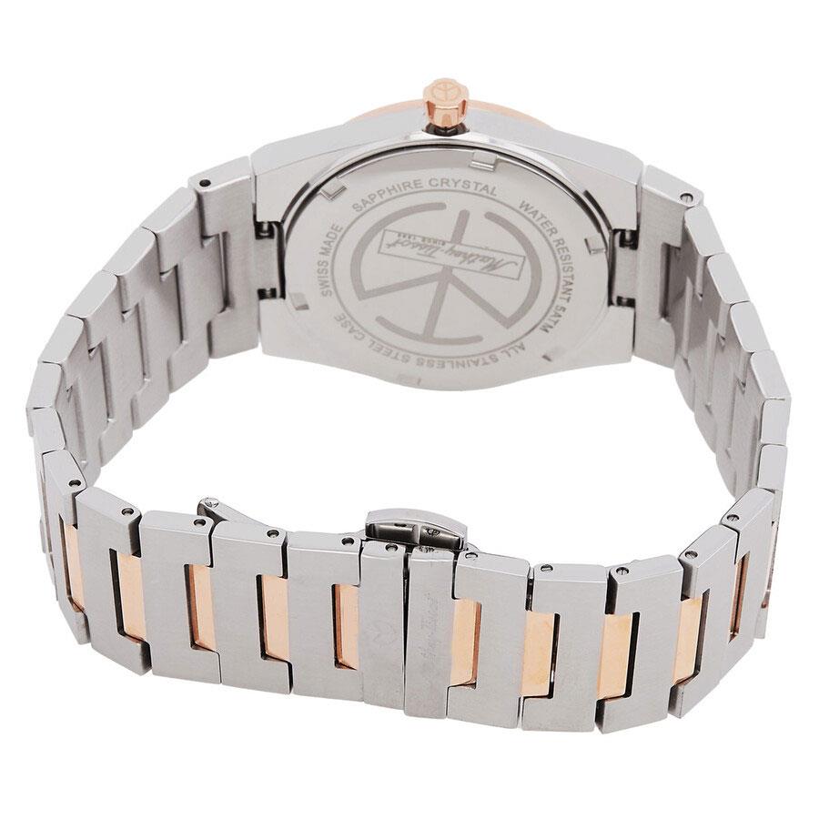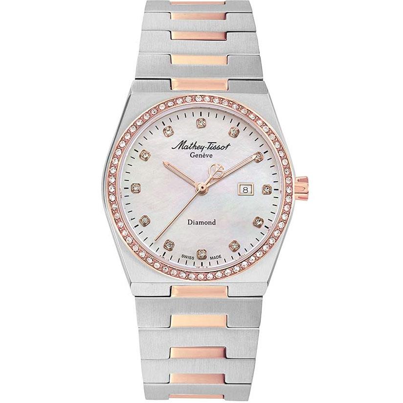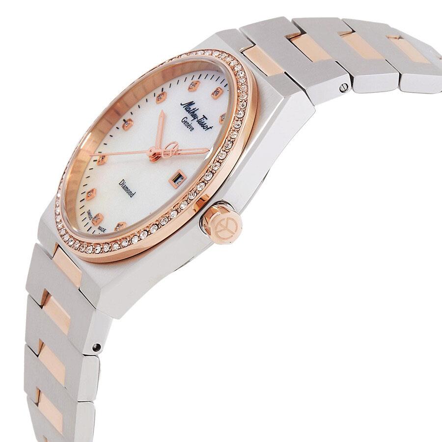 ساعت مچی زنانه متی تیسوت matheytissot با طراحی روزانه بند استیل مسی و قاب دور نگین مسی استیل با صفحه نگین دار سفید صدفی و شیشه ضد خراش و قابلیت داشتن تقویم و موتور سوییسی با انرژی باتری و مقاومت در برابر آب تا عمق 50 متربه همراه دو سال گارانتی بین المللی