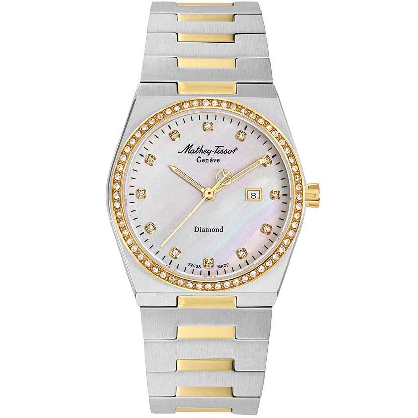 ساعت مچی زنانه متی تیسوت matheytissot با طراحی روزانه بند استیل طلایی و قاب دور نگین طلایی استیل با صفحه نگین دار سفید و شیشه ضد خراش و قابلیت داشتن تقویم و موتور سوییسی با انرژی باتری و مقاومت در برابر آب تا عمق 50 متربه همراه دو سال گارانتی بین المللی