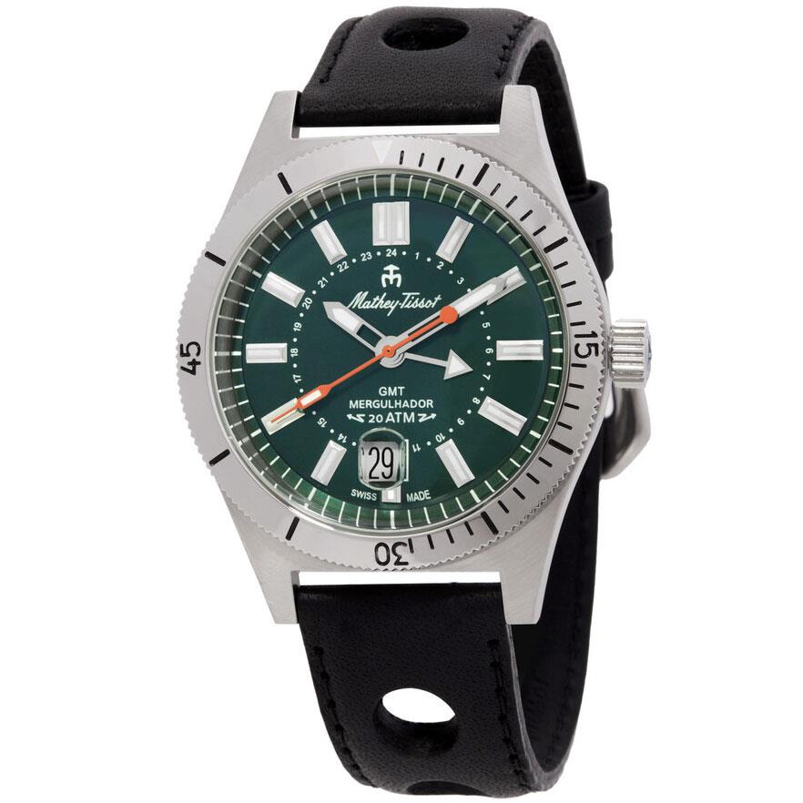 ساعت مچی مردانه متی تیسوت matheytissot با طراحی روزانه بند چرمی و قاب گرد استیل با صفحه گرد سبز و شیشه ضد خراش و موتور سوییسی با انرژی باتری و قابلیت داشتن زه چرخان/ شب نما/ تقویم / دوزمانه و مقاومت در برابر آب تا عمق 200 متر به همراه دو سال گارانتی بین المللی