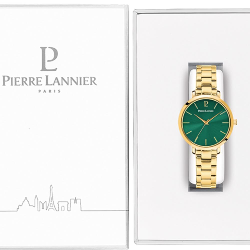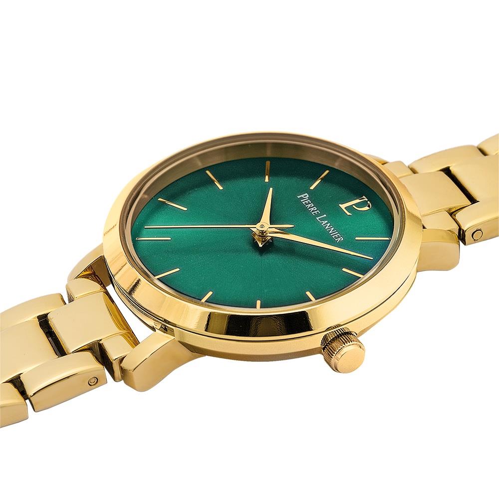 ساعت مچی زنانه پیرلنیر pierre lannier با طراحی روزانه بند فلزی طلایی و قاب فلزی طلایی و صفحه سبز و موتور ژاپنی با انرژی باتری و مقاوم در برابر آب تا عمق 30 متر به همراه گارانتی بین المللی