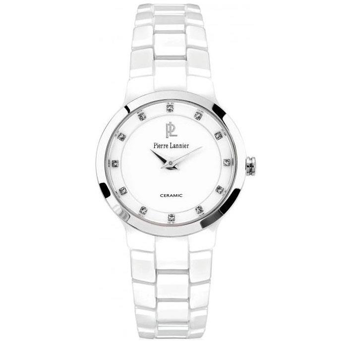 ساعت مچی زنانه  پیرلنیر pierre lannier با طراحی روزانه بند سرامیکی سفید و قاب سرامیک با زه استیل و صفحه نگین دار سفید و موتور ژاپنی با انرژی باتری و مقاوم در برابر آب تا عمق 30 متر به همراه گارانتی بین المللی