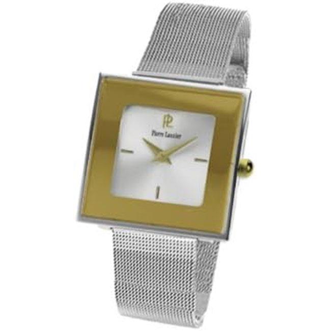 ساعت مچی زنانه  پیرلنیر pierre lannier با طراحی روزانه بند حصیر بافت استیل و قاب مربع طلایی استیل و صفحه مربعی نقره ای و موتور ژاپنی با انرژی باتری و مقاوم در برابر آب تا عمق 30 متر به همراه گارانتی بین المللی