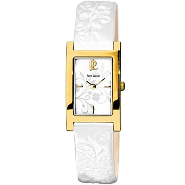 ساعت مچی زنانه  پیرلنیر pierre lannier با طراحی روزانه بند چرمی سفید و قاب مستطیلی طلایی و صفحه مستطیل سفید و موتور ژاپنی با انرژی باتری و مقاوم در برابر آب تا عمق 30 متر به همراه گارانتی بین المللی