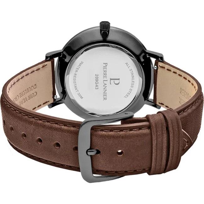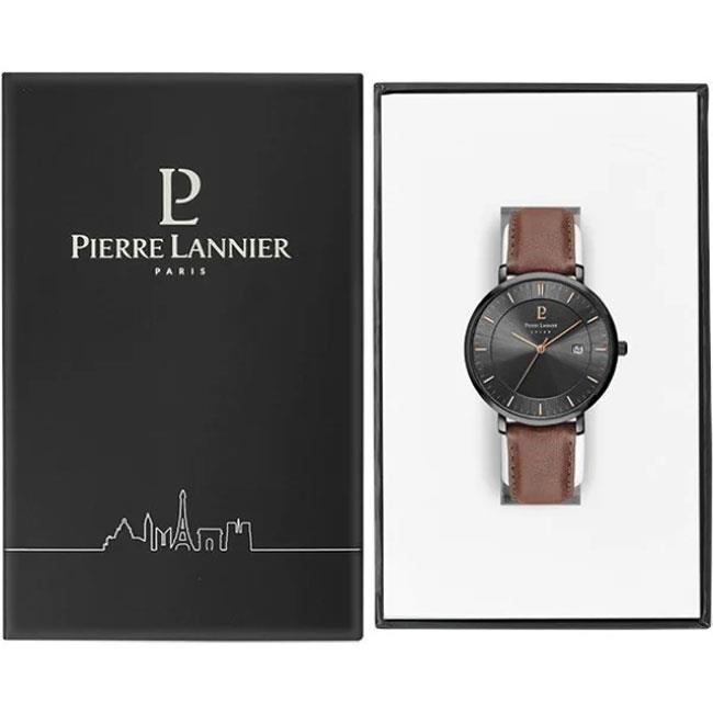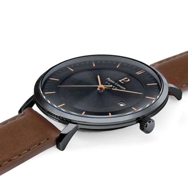 ساعت مچی مردانه پیرلنیر pierre lannier با طراحی روزانه بند چرمی قهوه ای و قاب گرد مشکی و صفحه گرد مشکی با قابلیت داشتن تقویم و موتور ژاپنی با انرژی خورشیدی و مقاوم در برابر آب تا عمق 30 متر به همراه گارانتی بین المللی