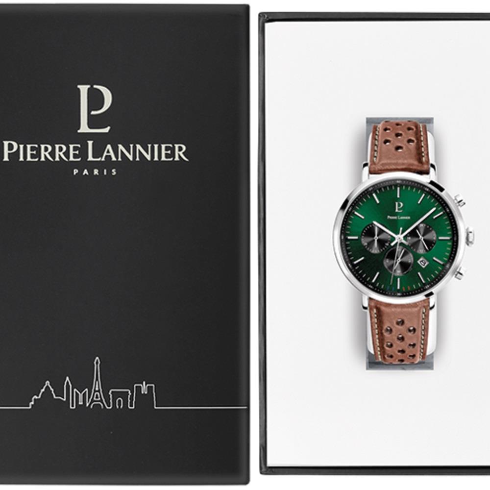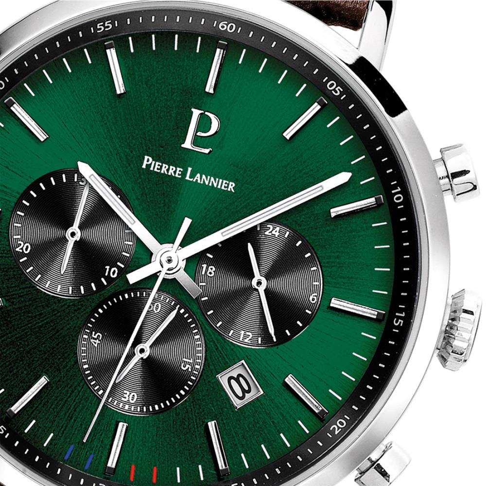 ساعت مچی مردانه پیرلنیر pierre lannier با طراحی روزانه بند چرمی قهوه ای و قاب گرد استیل و صفحه گرد سبز مشکی با قابلیت داشتن تقویم کرنوگراف شب نما و موتور ژاپنی با انرژی باتری و مقاوم در برابر آب تا عمق 50 متر به همراه گارانتی بین المللی