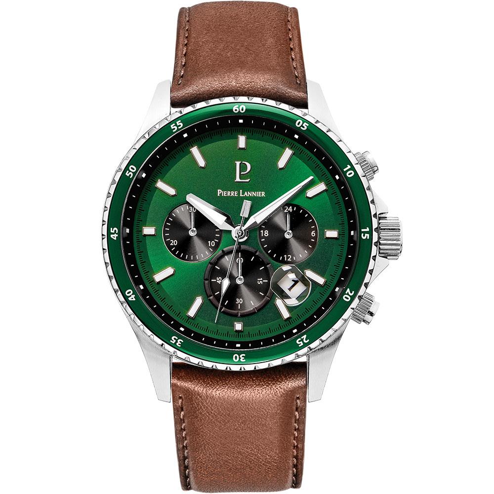 ساعت مچی مردانه پیرلنیر pierre lannier با طراحی روزانه بند چرمی قهوه ای و قاب گرد و صفحه گرد سبز با قابلیت داشتن تقویم کرنوگراف شب نما و موتور ژاپنی با انرژی باتری و مقاوم در برابر آب تا عمق 50 متر به همراه گارانتی بین المللی