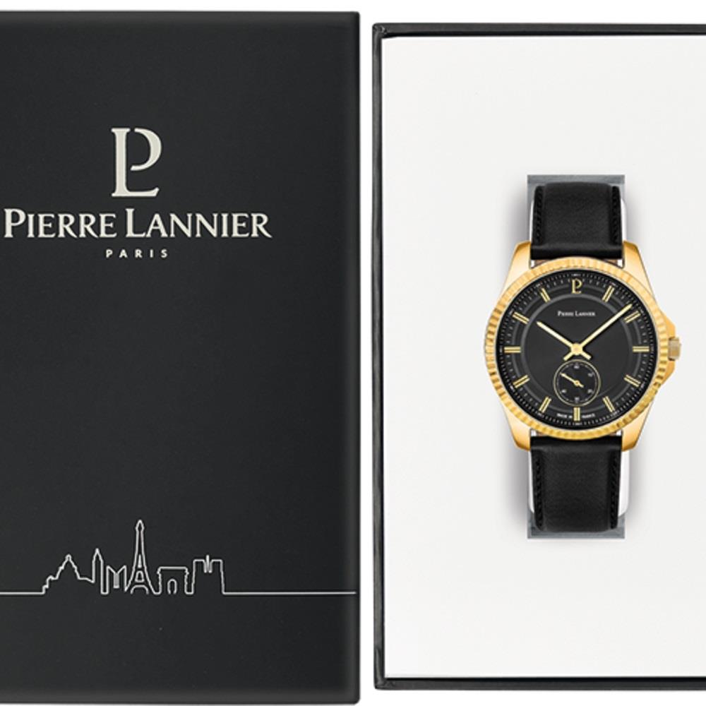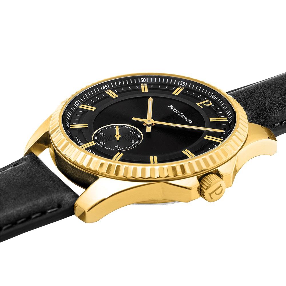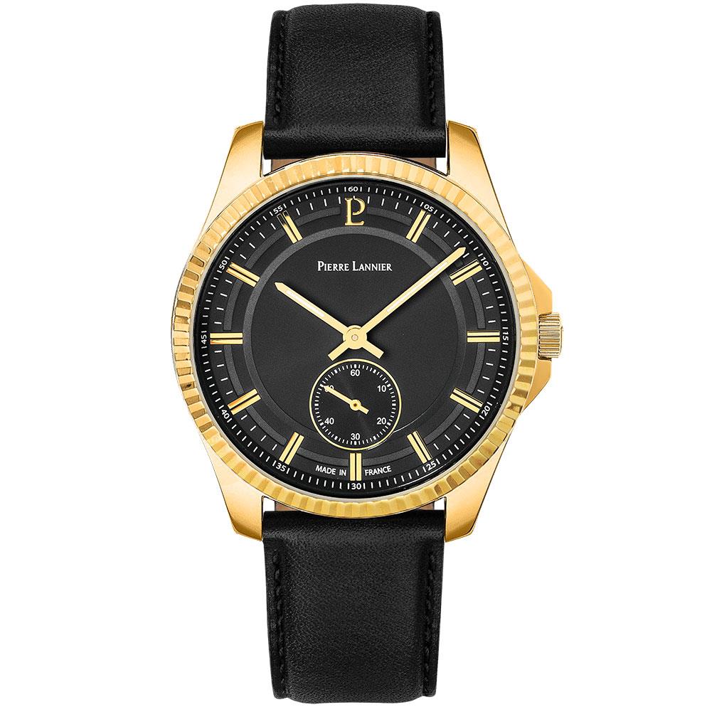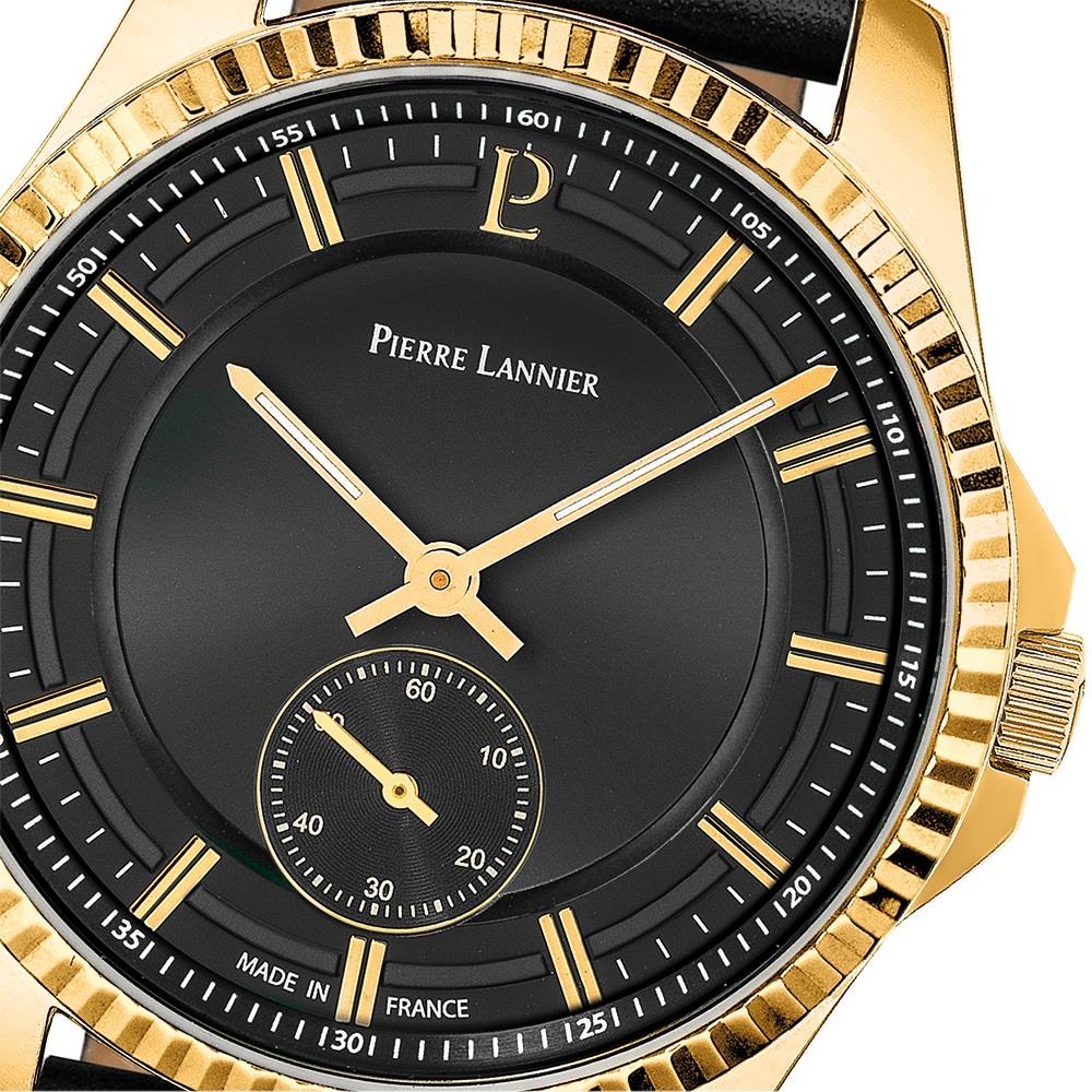 ساعت مچی مردانه پیرلنیر pierre lannier با طراحی روزانه بند چرمی و قاب گرد طلایی و صفحه گرد مشکی با قابلیت داشتن شب نما / زیر ثانیه و موتور ژاپنی با انرژی باتری و مقاوم در برابر آب تا عمق 50 متر به همراه گارانتی بین المللی