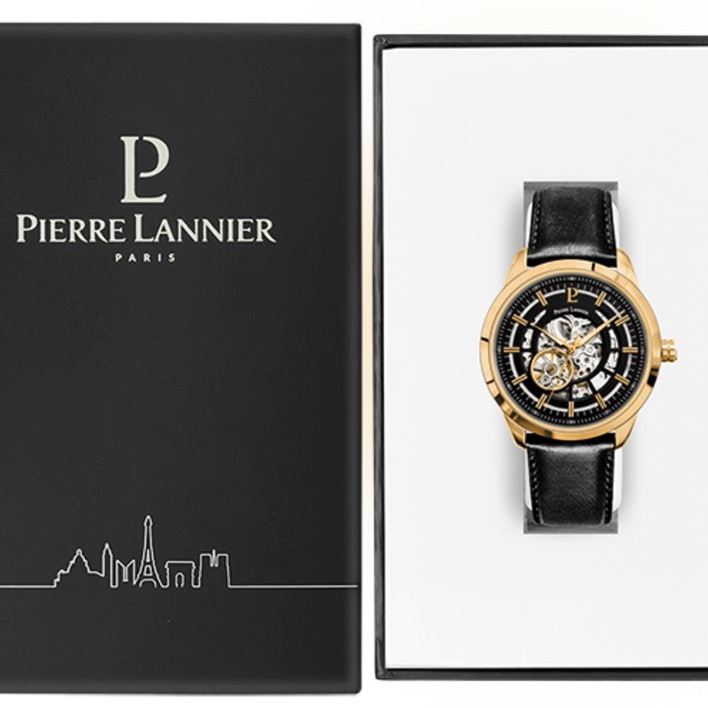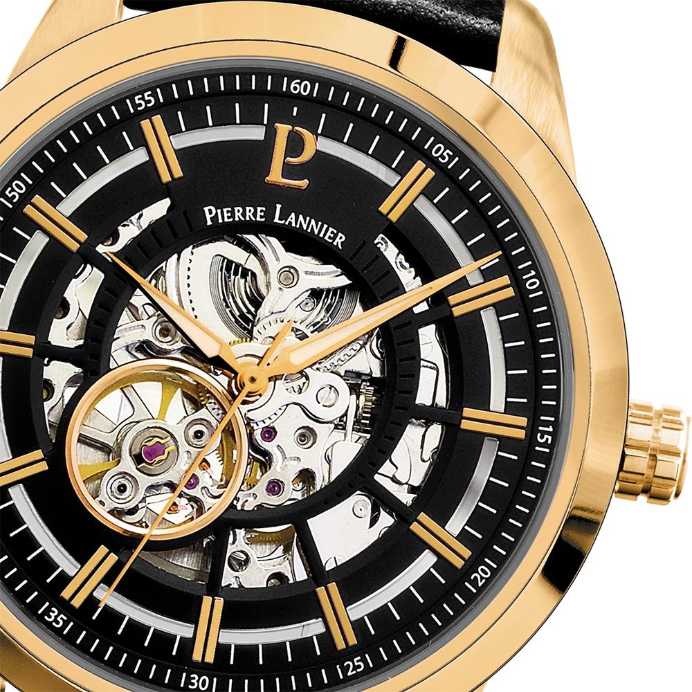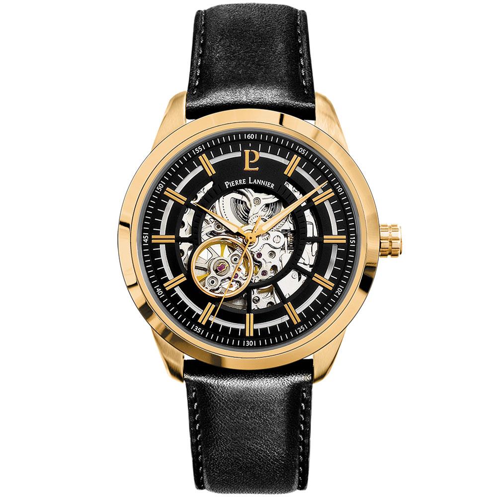 ساعت مچی مردانه پیرلنیر pierre lannier با طراحی روزانه بند چرمی مشکی و قاب گرد فلزی طلایی و صفحه اسکلتون مشکی طلایی  با قابلیت داشتن شب نما و موتور اتوماتیک ژاپنی با انرژی مکانیکی و مقاوم در برابر آب تا عمق 50 متر به همراه گارانتی بین المللی