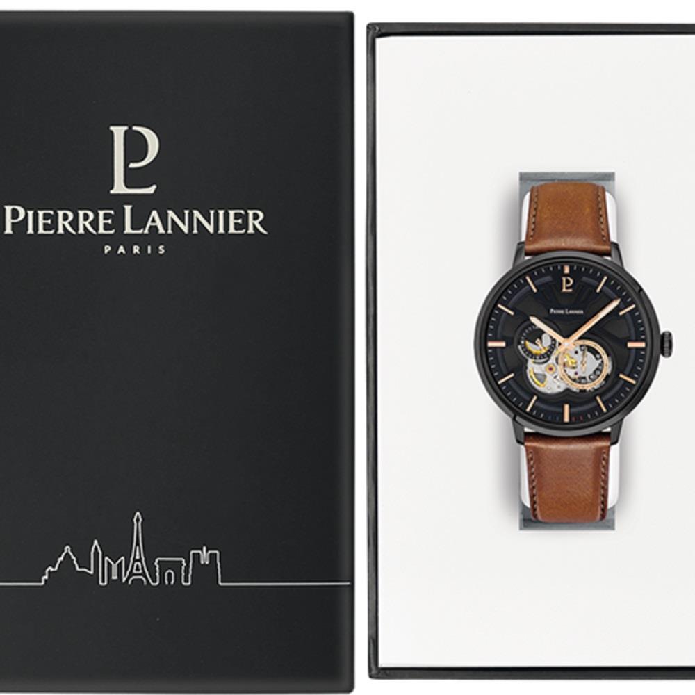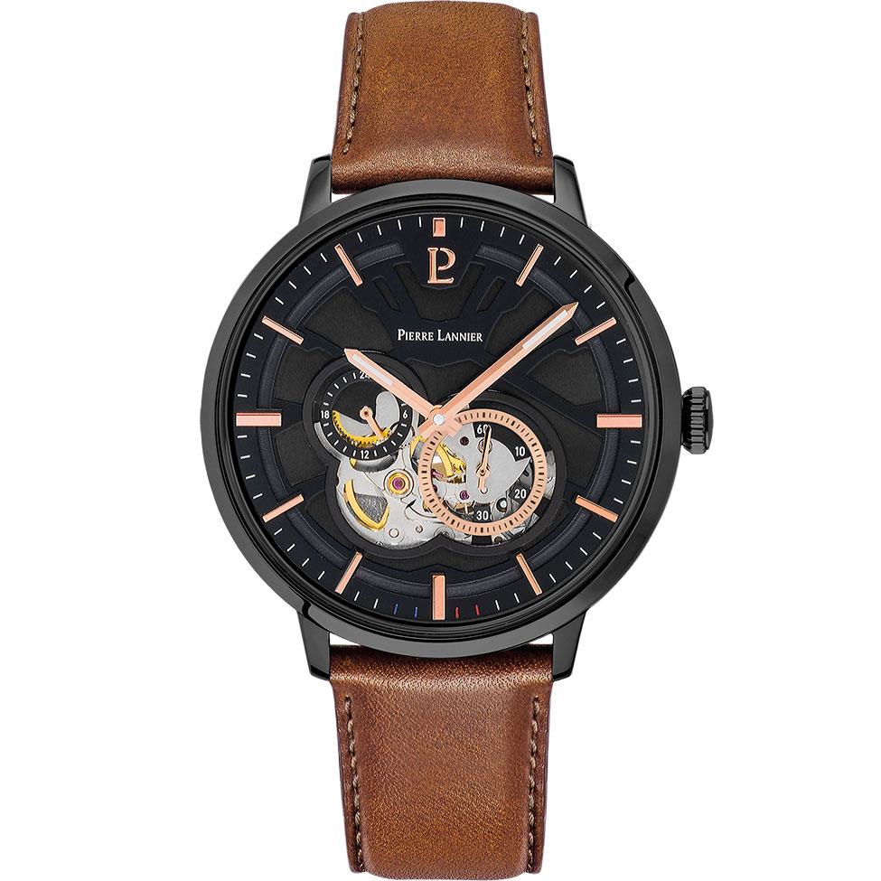 ساعت مچی مردانه پیرلنیر pierre lannier با طراحی روزانه بند چرمی قهوه ای و قاب گرد فلزی مشکی و صفحه قلب باز مشکی با قابلیت داشتن شب نما / روز و شب / زیر ثانیه و موتور اتوماتیک ژاپنی با انرژی مکانیکی و مقاوم در برابر آب تا عمق 50 متر به همراه گارانتی بین المللی