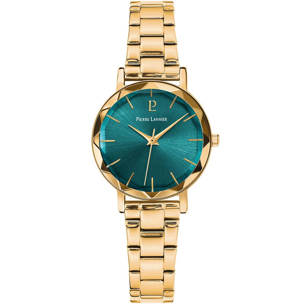 ساعت مچی زنانه پیر لنیر pierre lannier با طراحی کلاسیک بند فلزی طلایی و قاب گرد طلایی با صفحه گرد سبز و موتور ژاپنی با انرژی باتری و مقاوم در برابر آب تا عمق 30 متر به همراه گارانتی بین المللی