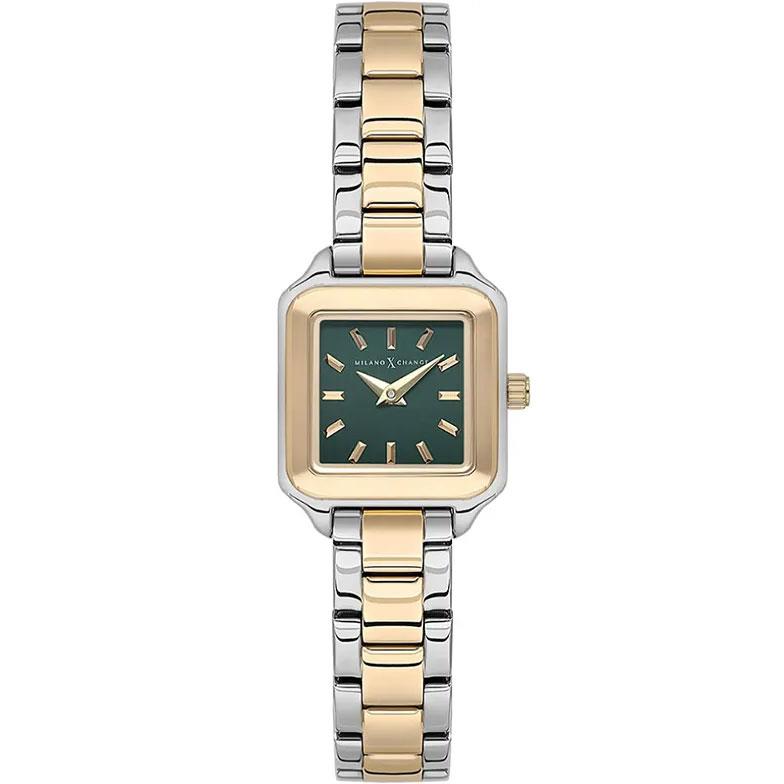 ساعت مچی زنانه میلانواکسچنج milanoxchange با طراحی روزانه بند استیل طلایی و قاب مربعی طلایی استیل و صفحه مربع سبز و موتور ژاپنی با انرژی باتری و مقاوم در برابر آب تا عمق 30 متر به همراه گارانتی بین المللی