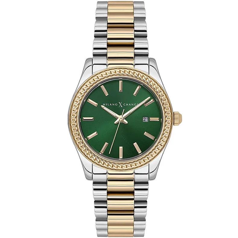 ساعت مچی زنانه میلانواکسچنج milanoxchange با طراحی روزانه بند استیل طلایی و قاب گرد طلایی استیل و صفحه گرد سبز با قابلیت داشتن تقویم / شب نما و موتور ژاپنی با انرژی باتری و مقاوم در برابر آب تا عمق 50 متر به همراه گارانتی بین المللی