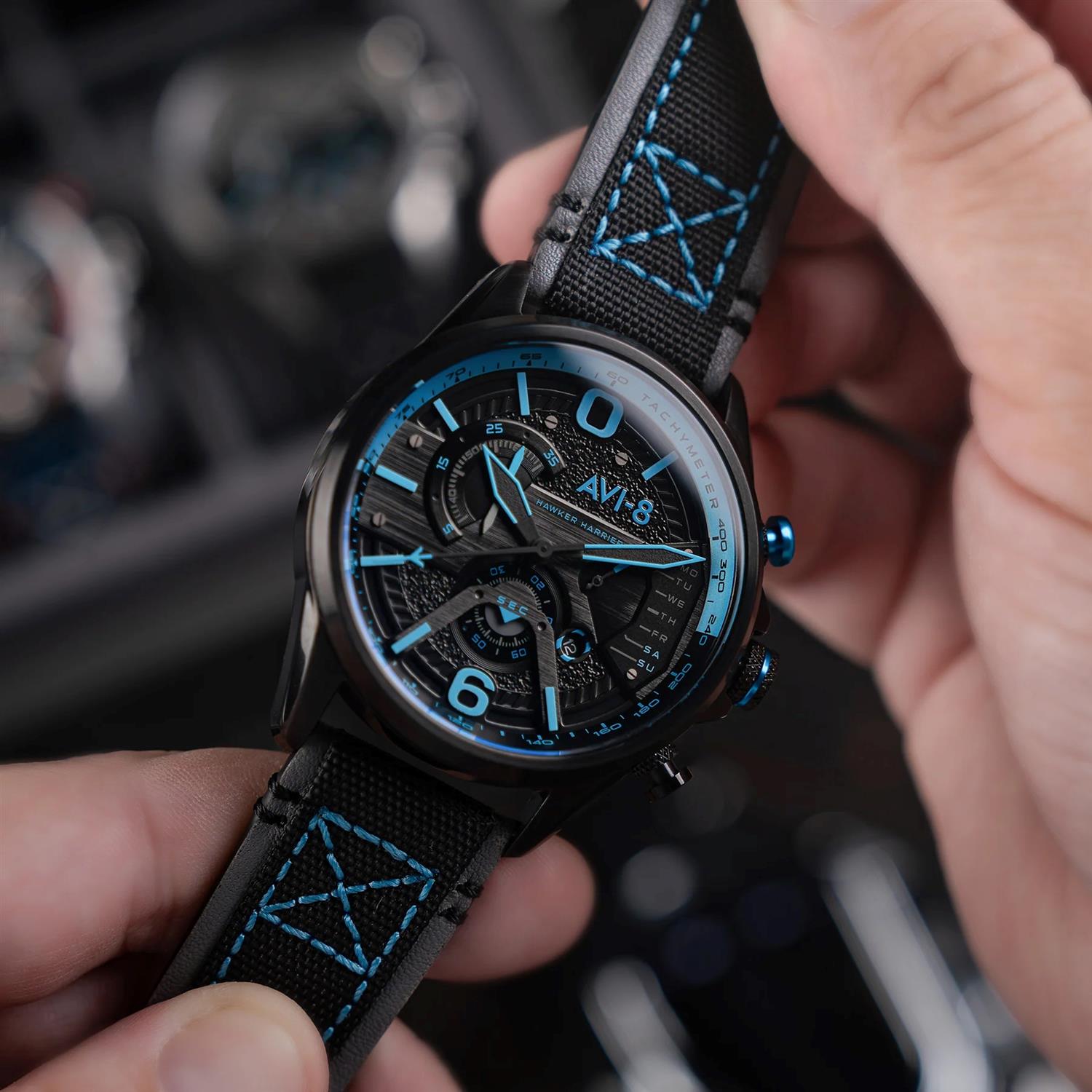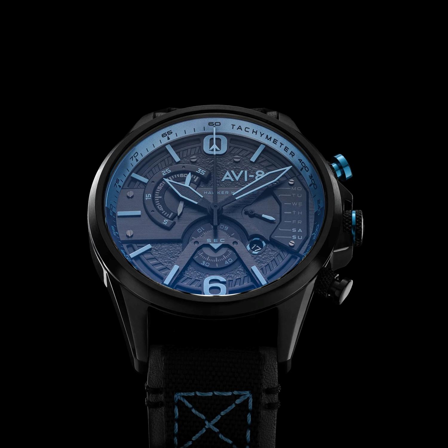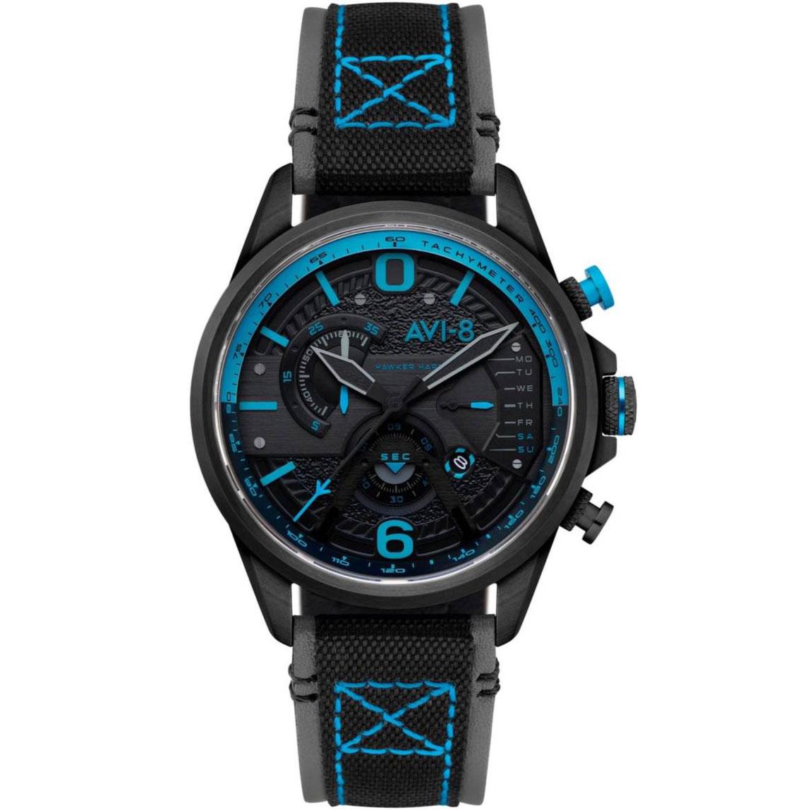 ساعت مچی مردانه ای وی ایت AVI-8 با طراحی روزانه بند چرمی برزنتی/ قاب فلزی مشکی و صفحه مشکی آبی با شیشه ضد انعکاس نور و قابلیت داشتن شب نما /کرنوگراف/ تقویم / زه تاچی متر/ روزهای هفته وموتور ژاپنی با انرژی باتری ومقاوم در برابر آب تا عمق 50 متر به همراه گارانتی بین المللی