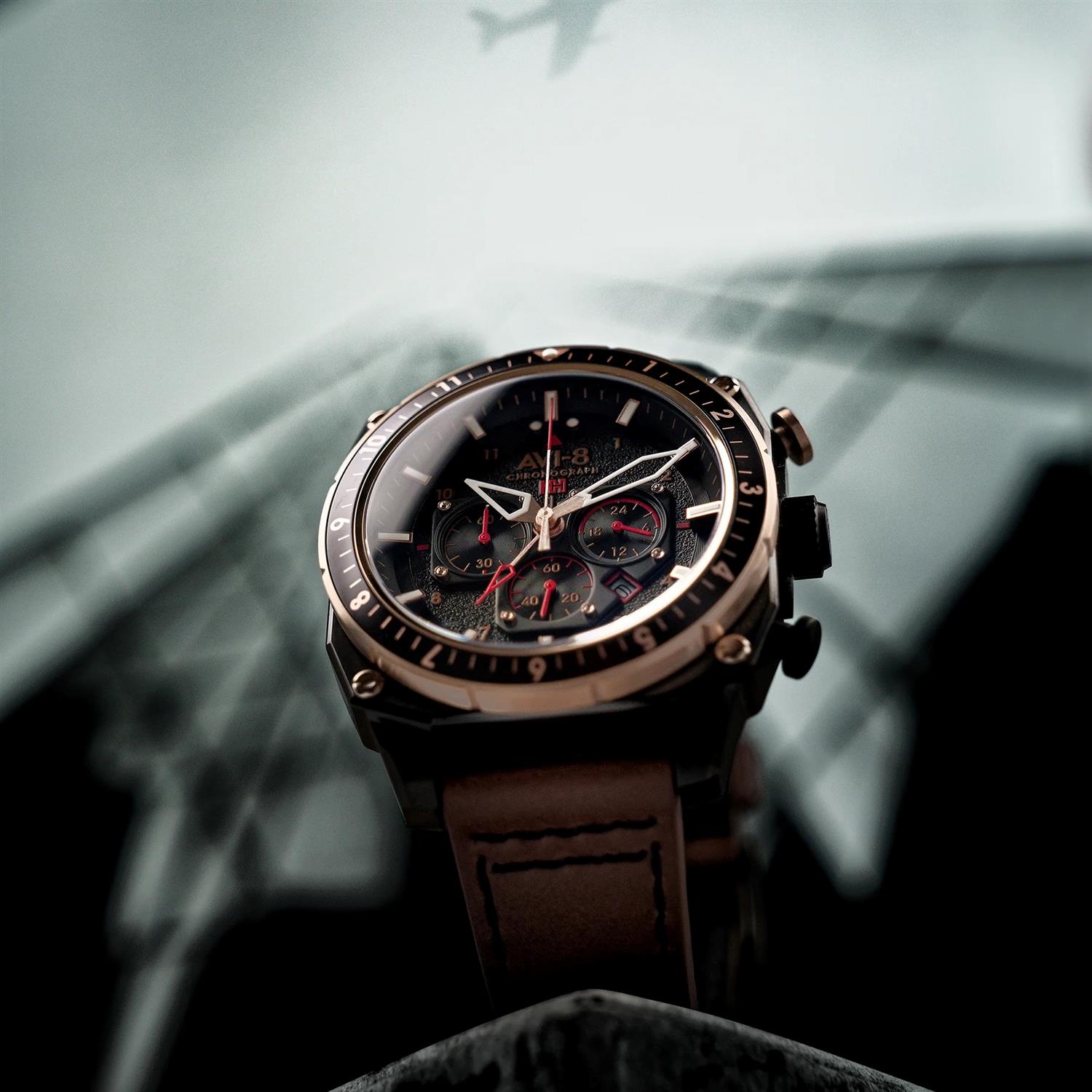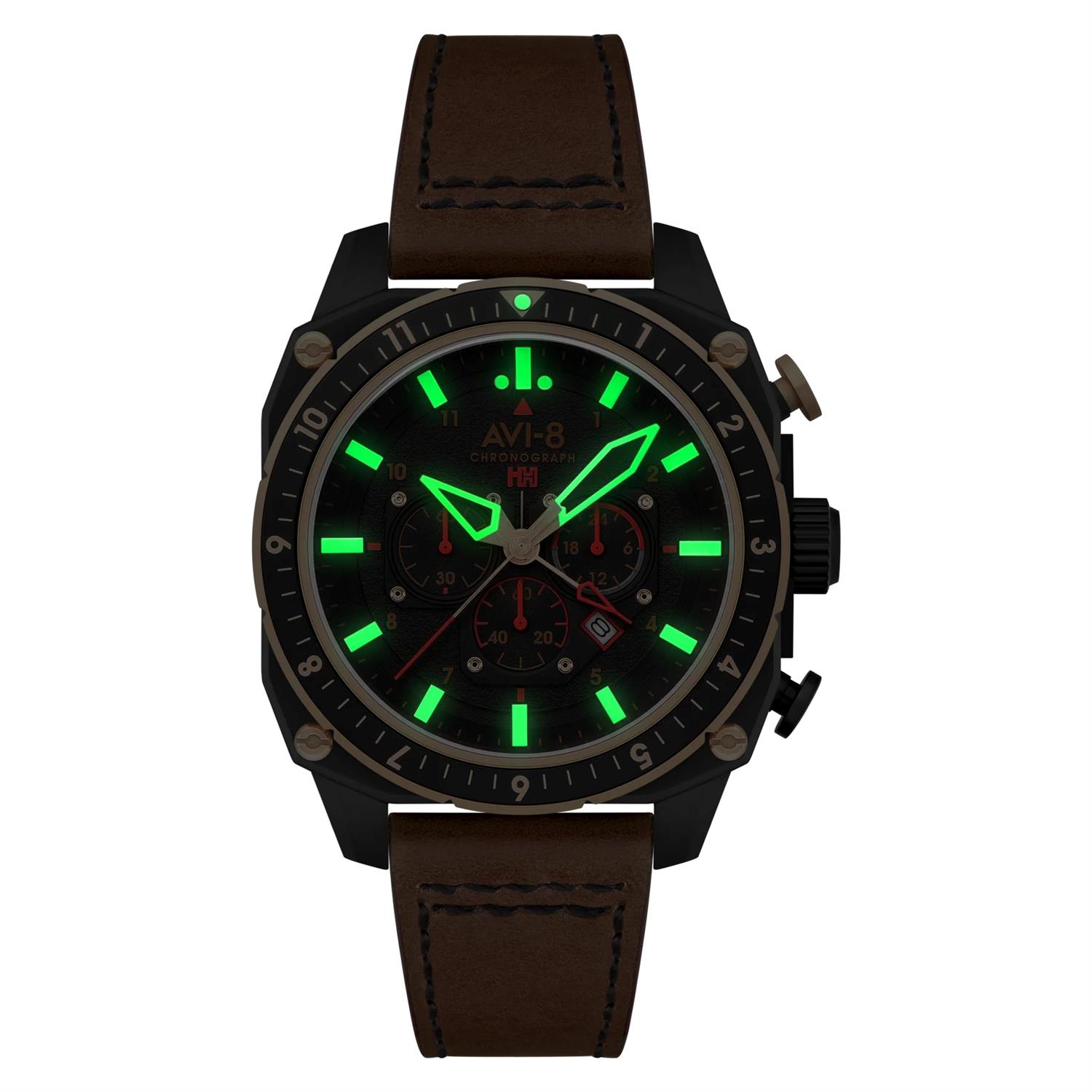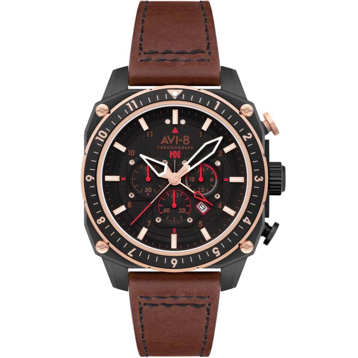 ساعت مچی مردانه ای وی ایت AVI-8 با طراحی روزانه بند چرمی قهوه ای/  قاب گرد مشکی مسی و صفحه گرد مشکی با شیشه ضد انعکاس نور و قابلیت داشتن شب نما / تقویم / زه چرخان / کرنوگراف و موتور ژاپنی با انرژی باتری و مقاوم در برابر آب تا عمق 50 متر به همراه گارانتی بین المللی
