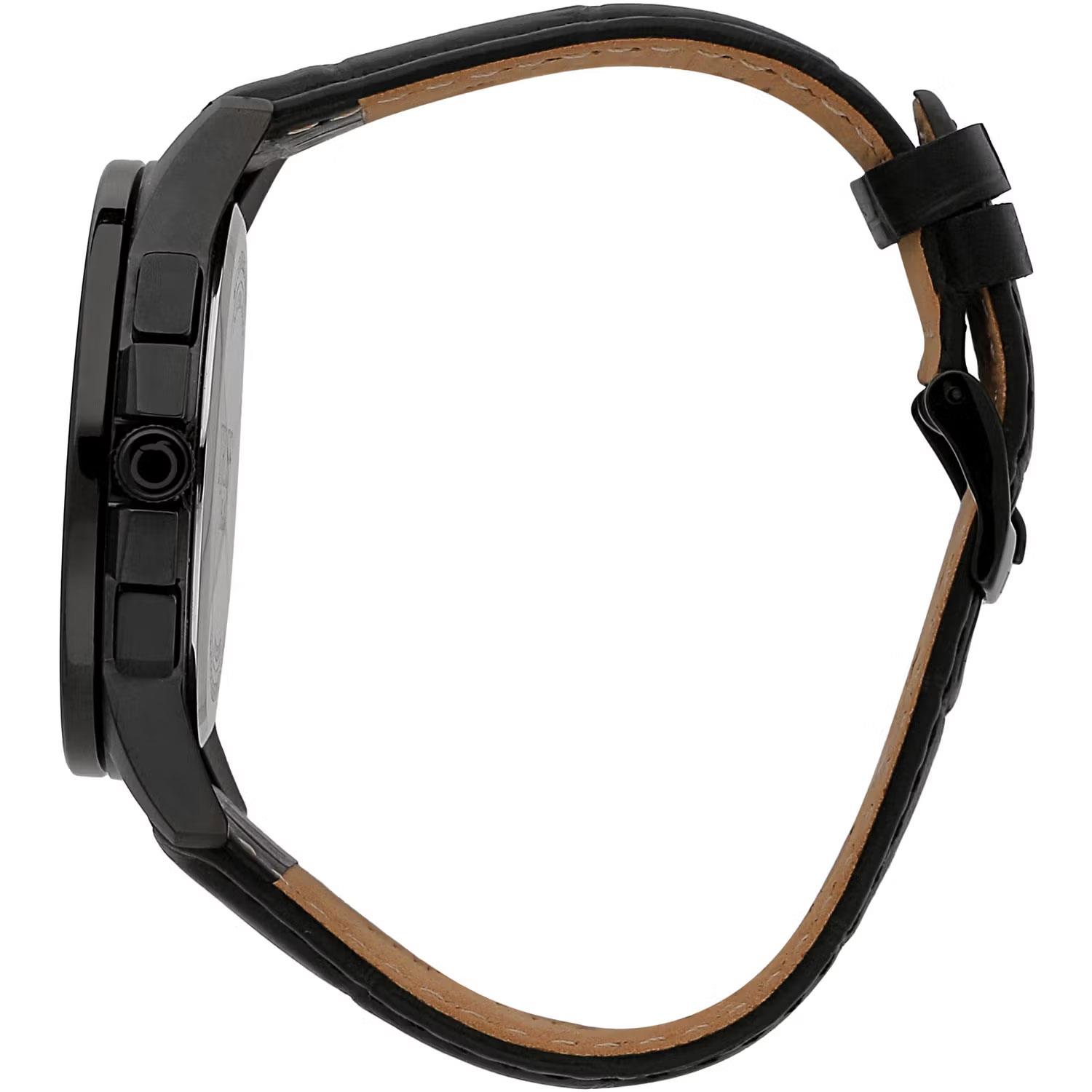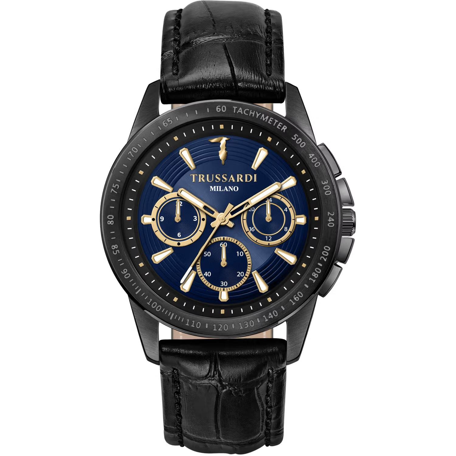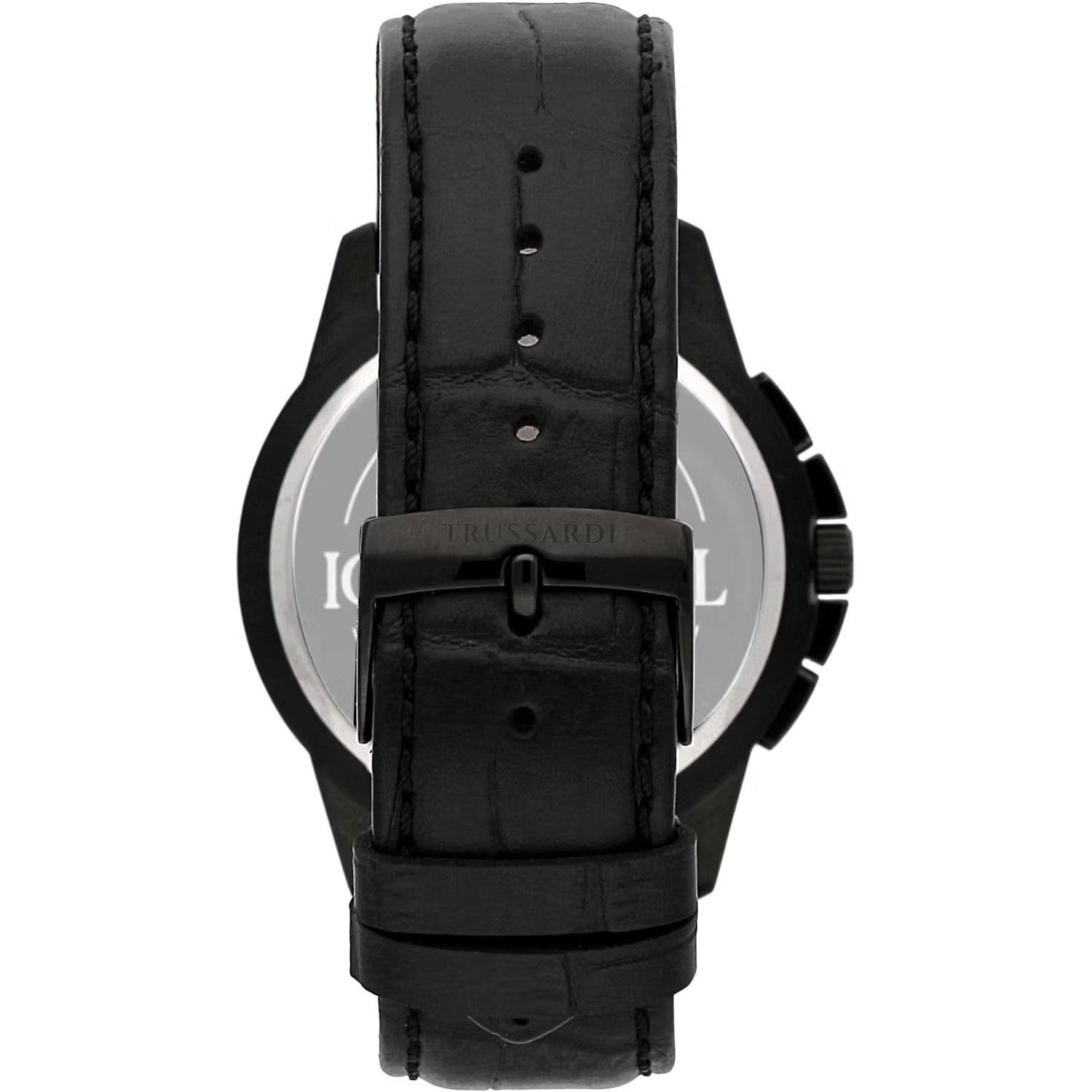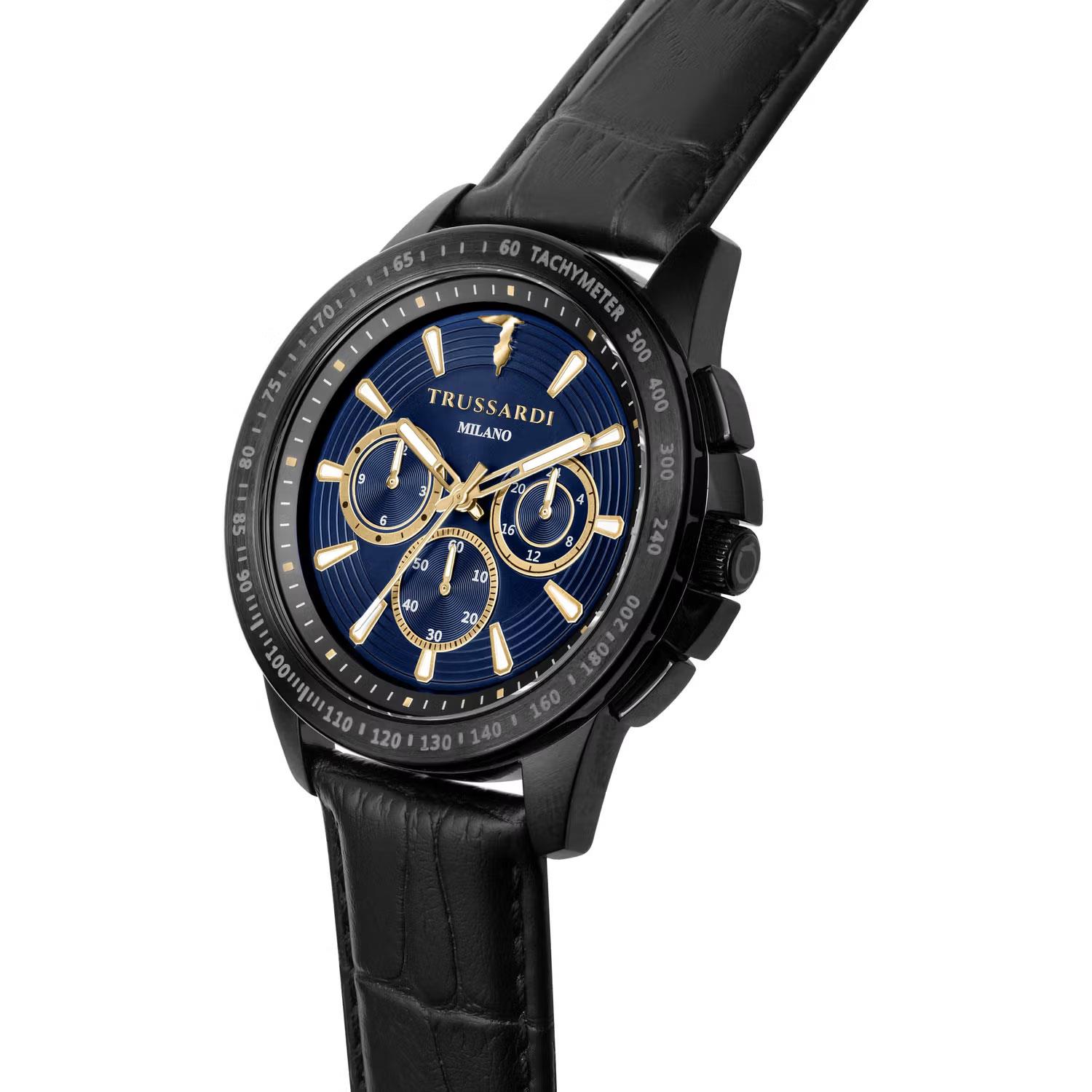 ساعت مچی مردانه Trussardi تروساردی با طراحی روزانه بند چرمی و قاب فلزی مشکی و صفحه گرد سرمه ای با قابلیت داشتن کرنوگراف /زه تاچی متر / شب نما و موتور ژاپنی با انرژی باتری و مقاومت در برابر آب تا عمق 50 متر به همراه گارانتی بین المللی