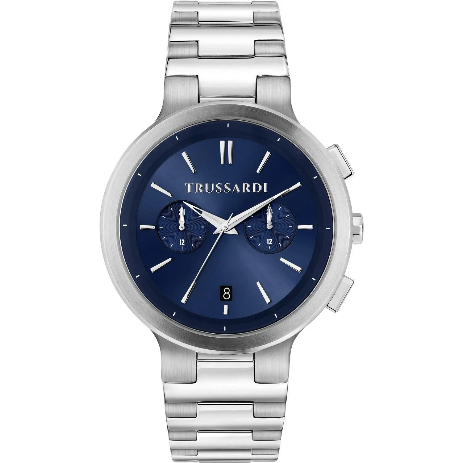 ساعت مچی مردانه Trussardi با طراحی کلاسیک بند استیل و قاب گرد استیل و صفحه گرد سرمه ای با قابلیت داشتن دوزمانه /شب نما / تقویم و موتور ژاپنی با انرژی باتری و مقاومت در برابر آب تا عمق 50 متر به همراه دو سال گارانتی بین المللی