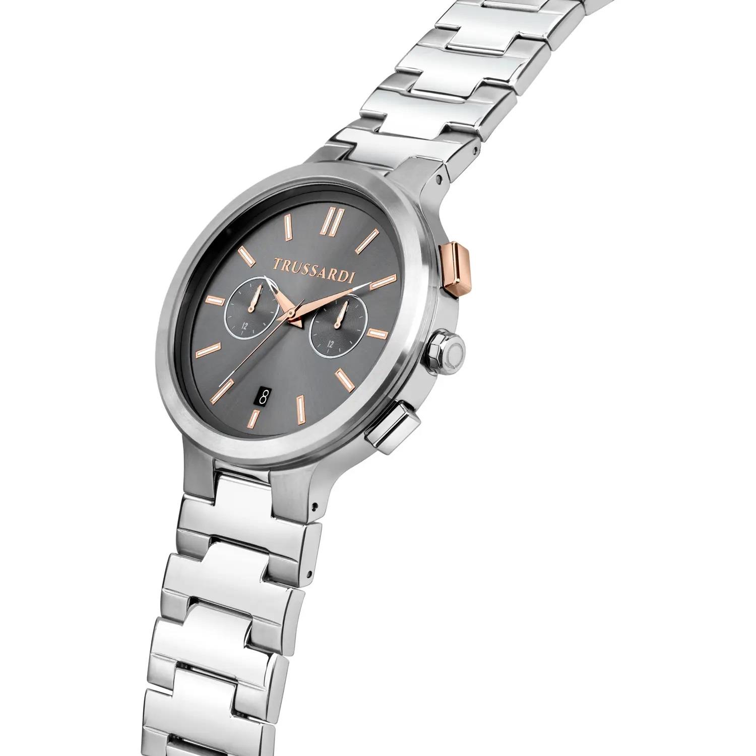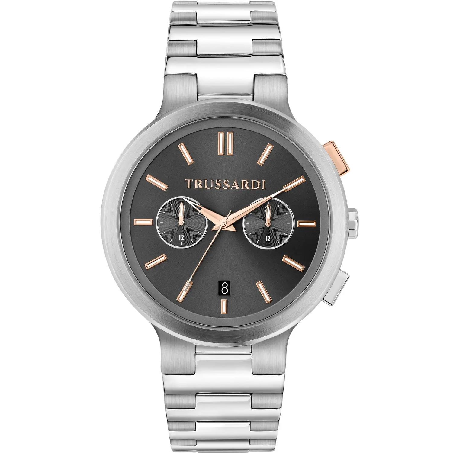 ساعت مچی مردانه Trussardi با طراحی کلاسیک بند استیل و قاب گرد استیل و صفحه گرد دودی با قابلیت داشتن دوزمانه /شب نما / تقویم و موتور ژاپنی با انرژی باتری و مقاومت در برابر آب تا عمق 50 متر به همراه دو سال گارانتی بین المللی