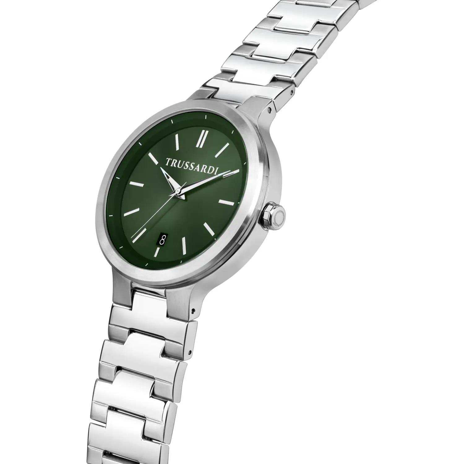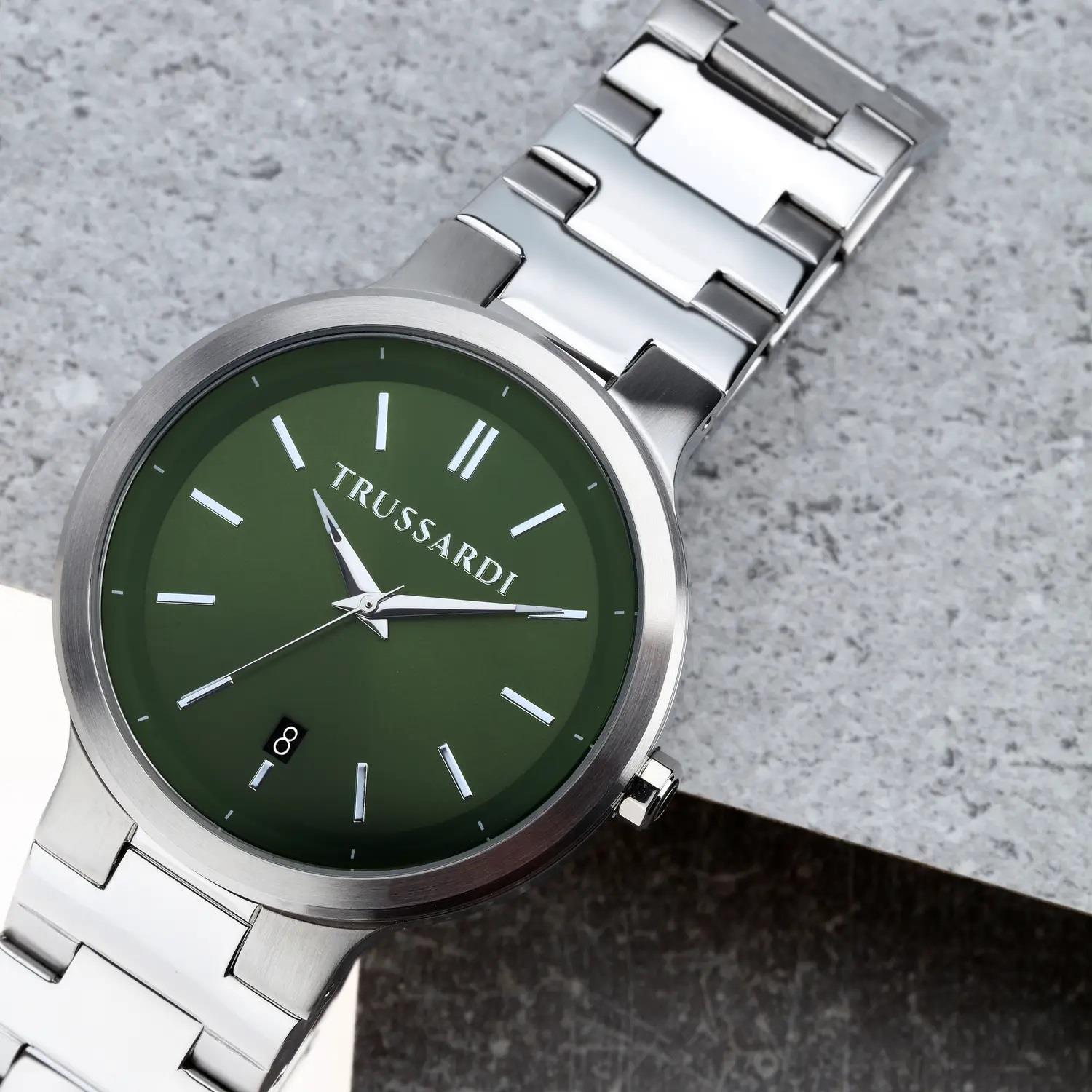 ساعت مچی مردانه Trussardi با طراحی کلاسیک بند استیل و قاب گرد استیل و صفحه گرد سبز با قابلیت داشتن شبنما/ تقویم و موتور ژاپنی با انرژی باتری و مقاومت در برابر آب تا عمق 50 متر به همراه دو سال گارانتی بین المللی