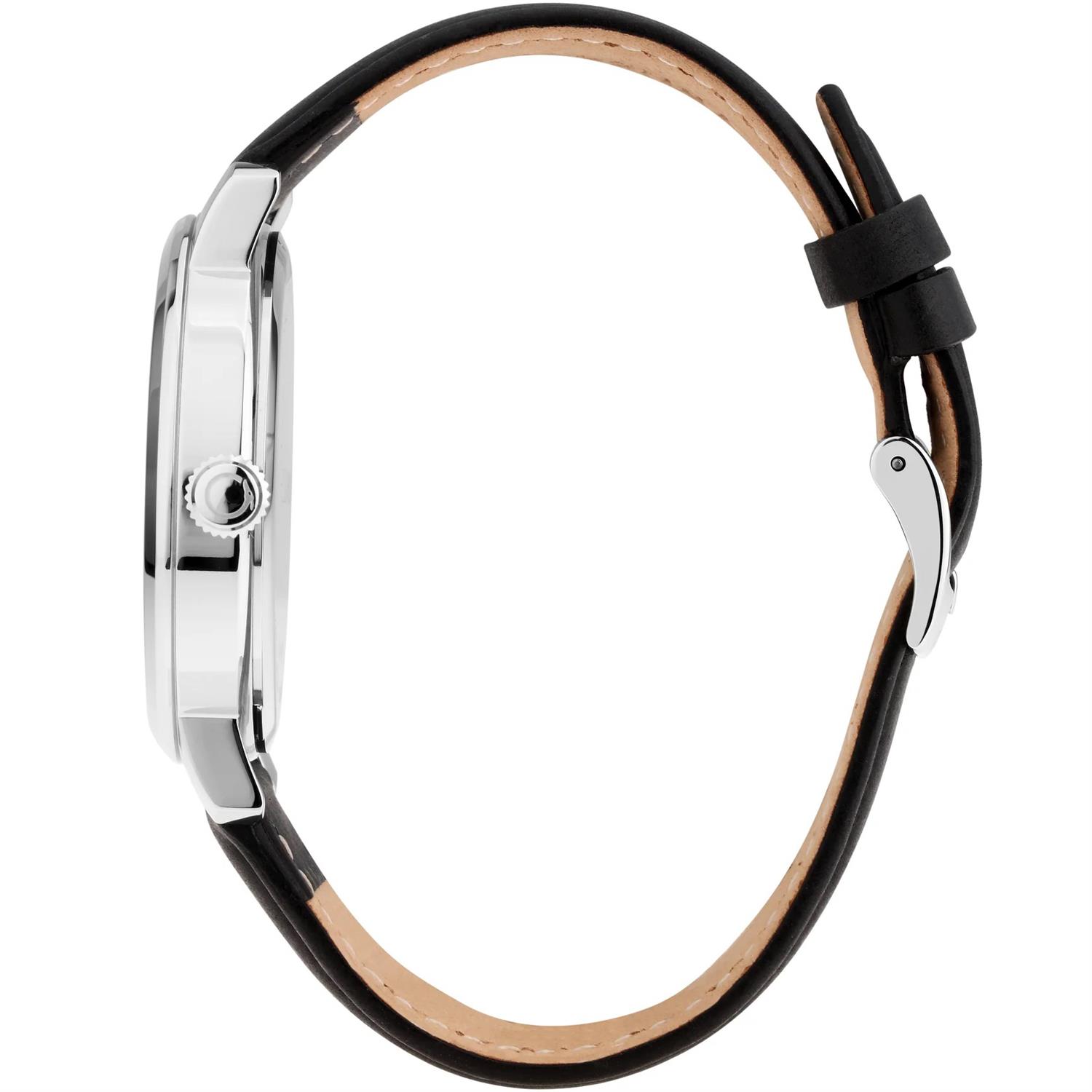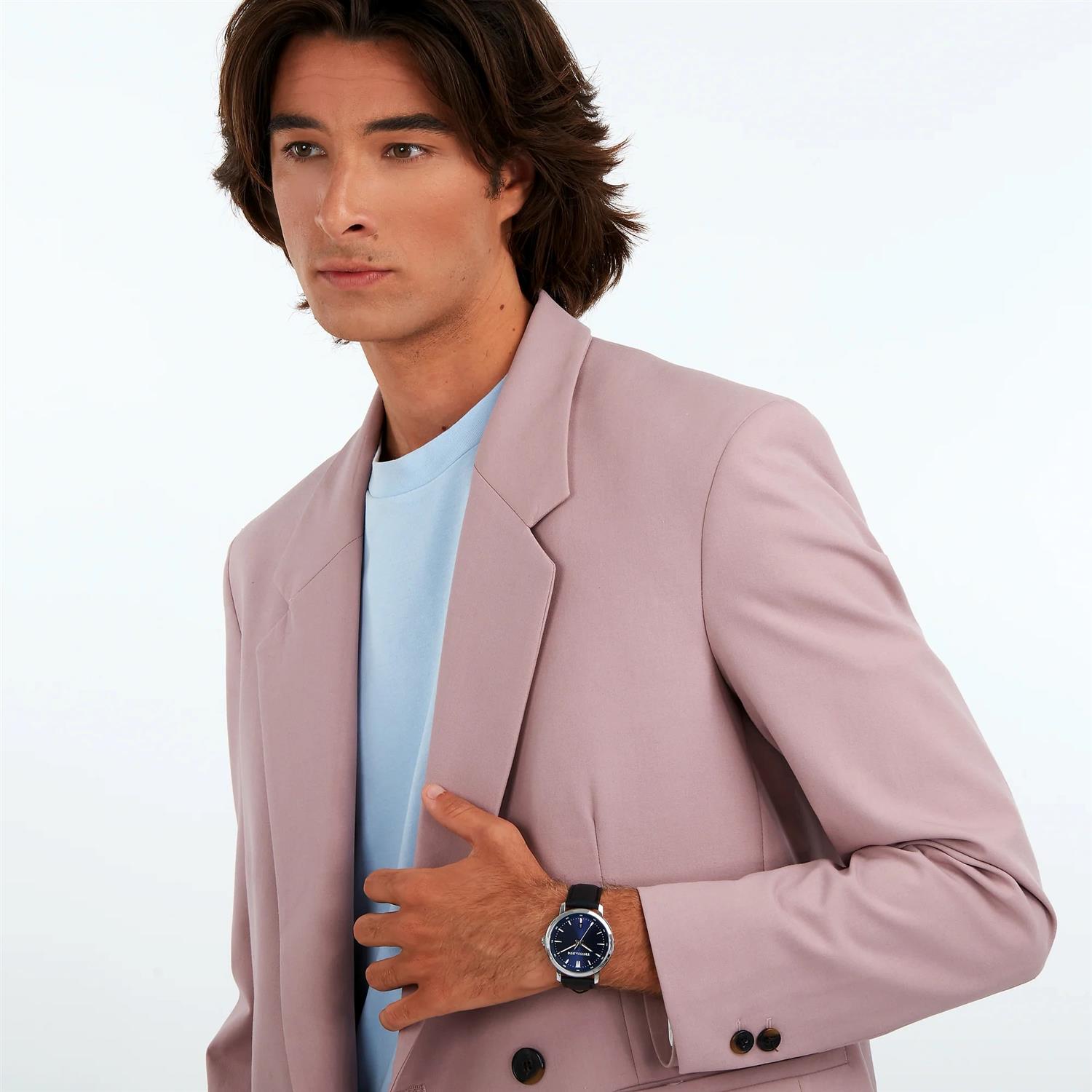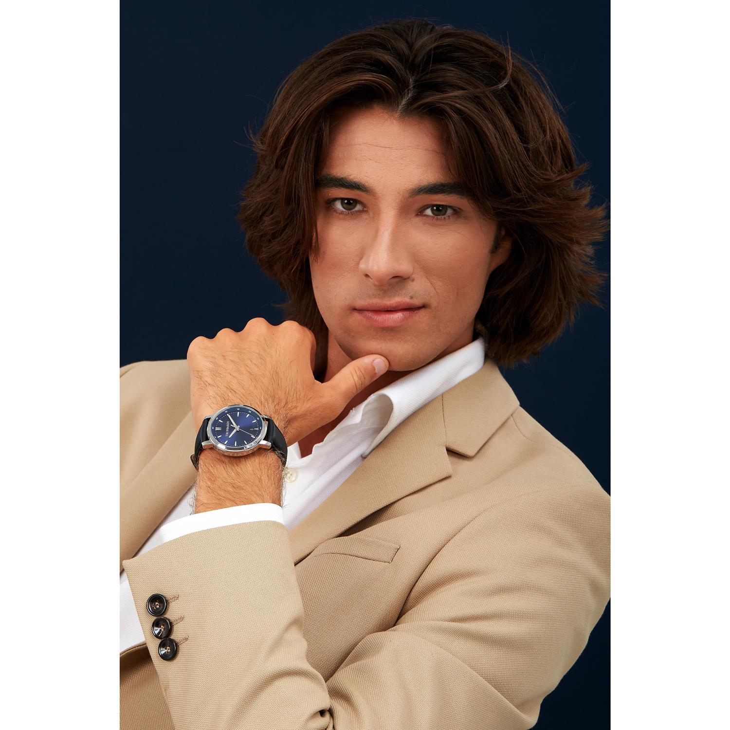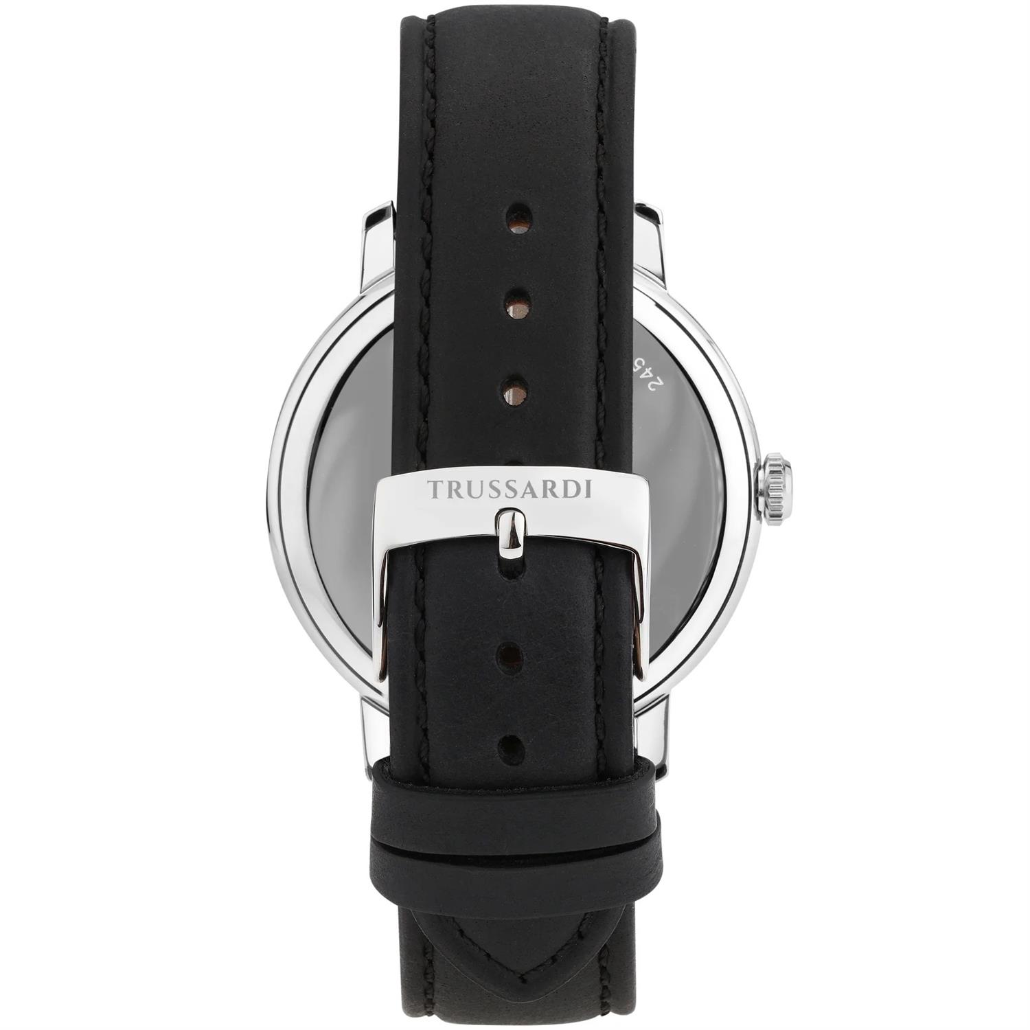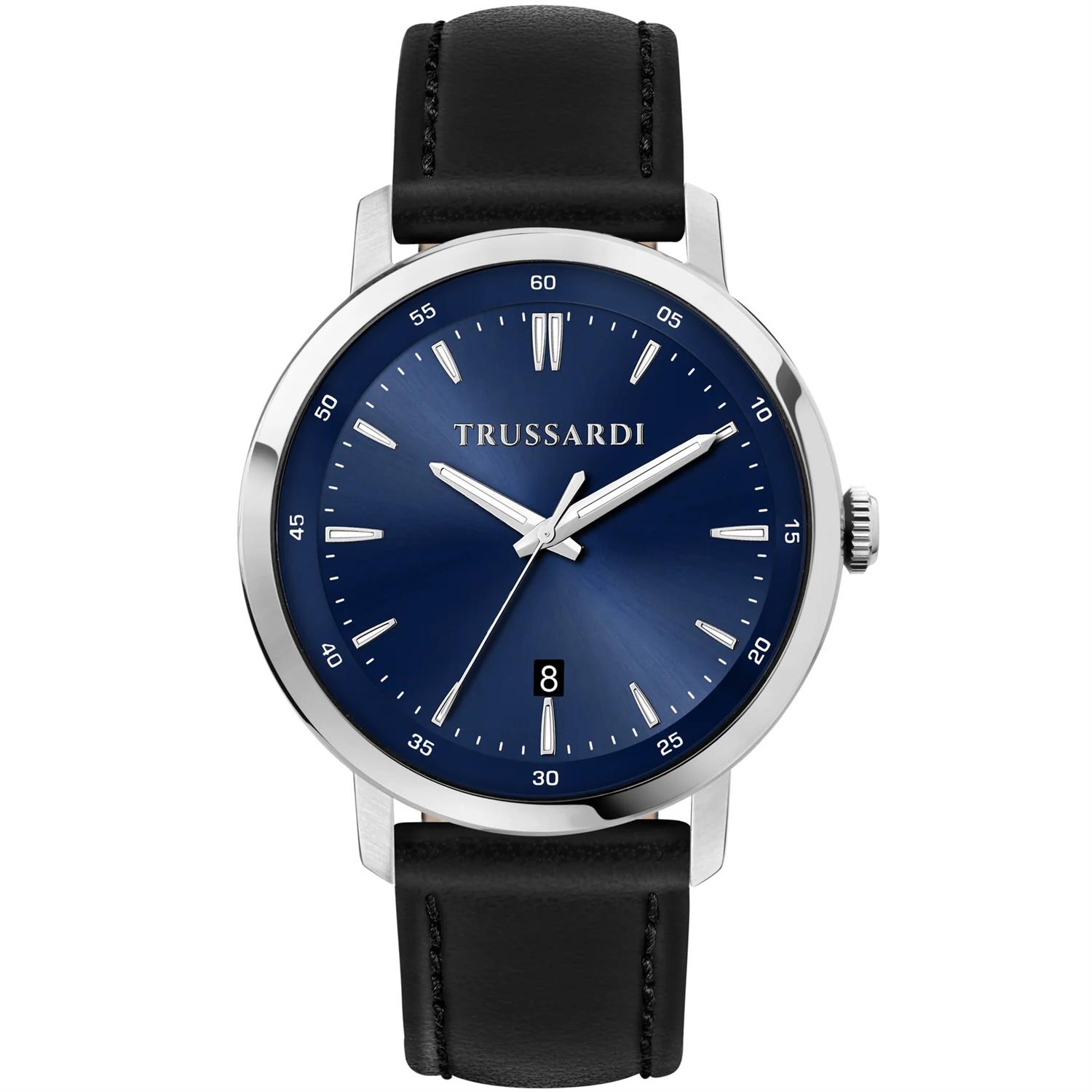 ساعت مچی مردانه Trussardi با طراحی روزانه بند چرمی مشکی و قاب گرد استیل و صفحه گرد سرمه ای و قابلیت داشتن تقویم / شب نما و موتور ژاپنی با انرژی باتری و مقاومت در برابر آب تا عمق 50 متر به همراه دو سال گارانتی بین المللی