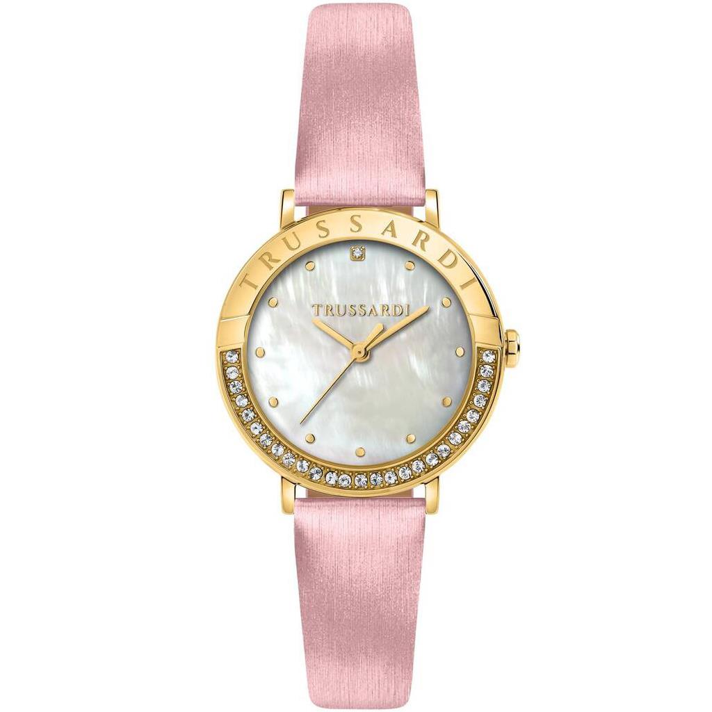 ساعت مچی زنانه Trussardi با طراحی کلاسیک بند چرمی صورتی و قاب نگین دارطلایی و صفحه نگین دار سفید صدفی و موتور ژاپنی با انرژی باتری و مقاومت در برابر آب تا عمق 50 متر به همراه گارانتی بین المللی